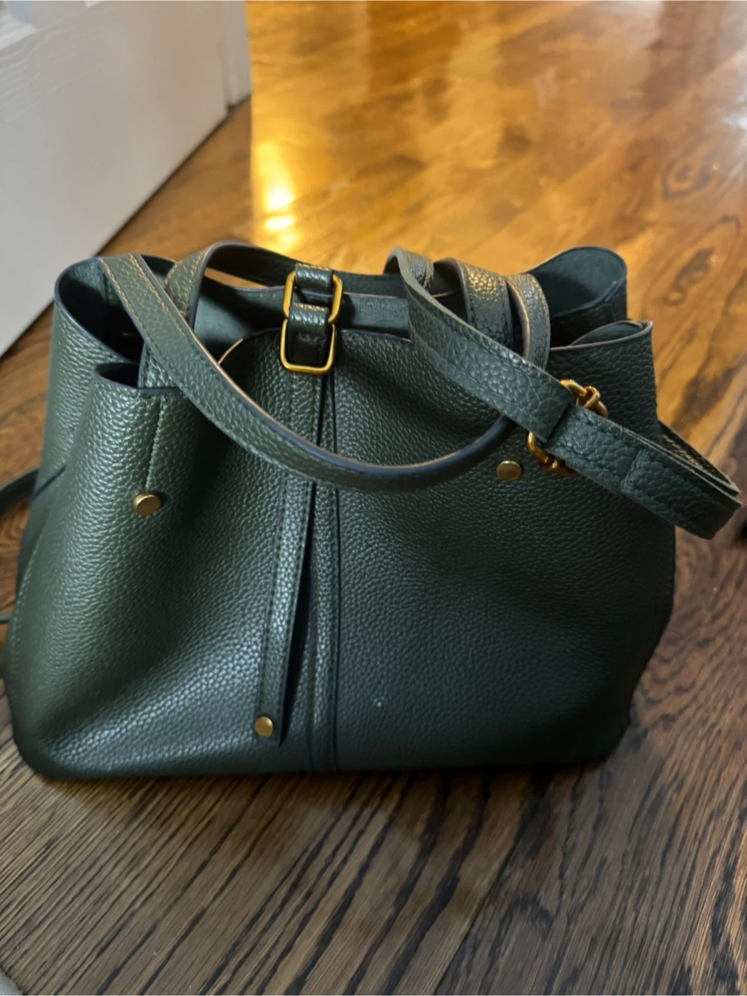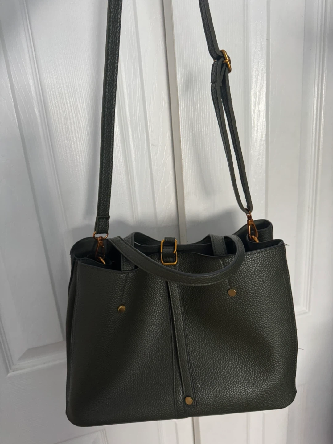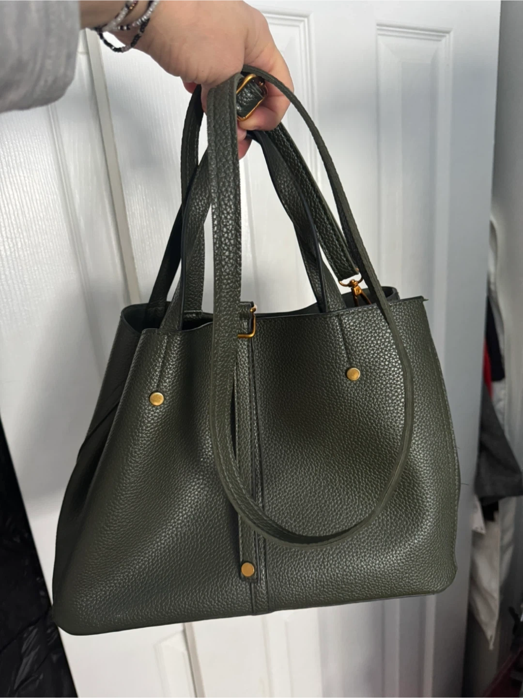 This dark green tote handbag is made from textured faux leather. It features a central zippered compartment and multiple carrying options with its top handles and adjustable shoulder strap. It's a versatile accessory for everyday use!