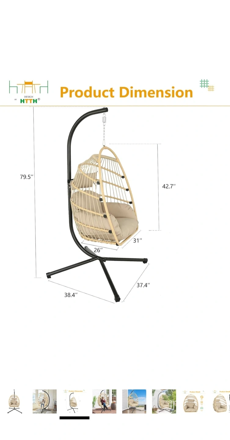 Wicker egg chair with a metal stand and beige cushion. Includes a safety strap and foldable storage. This chair is 79.5 inches tall and perfect for your patio or living room!