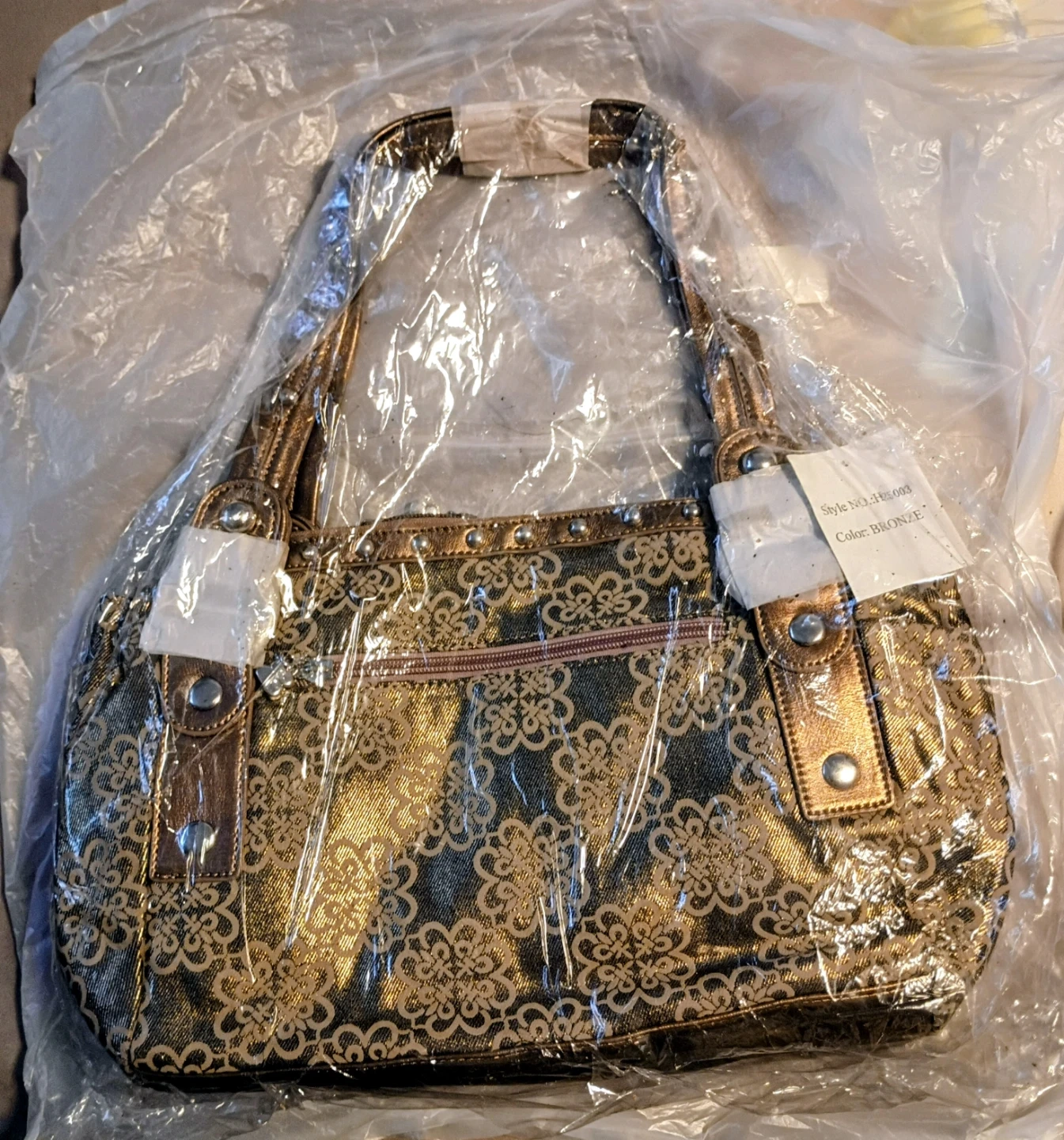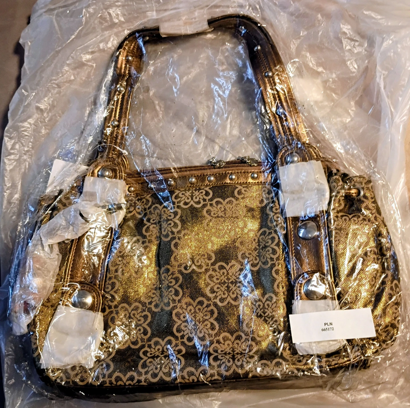 This is a gold-colored shoulder bag with a patterned design. It features a zippered top closure and decorative stud accents. The interior is lined.