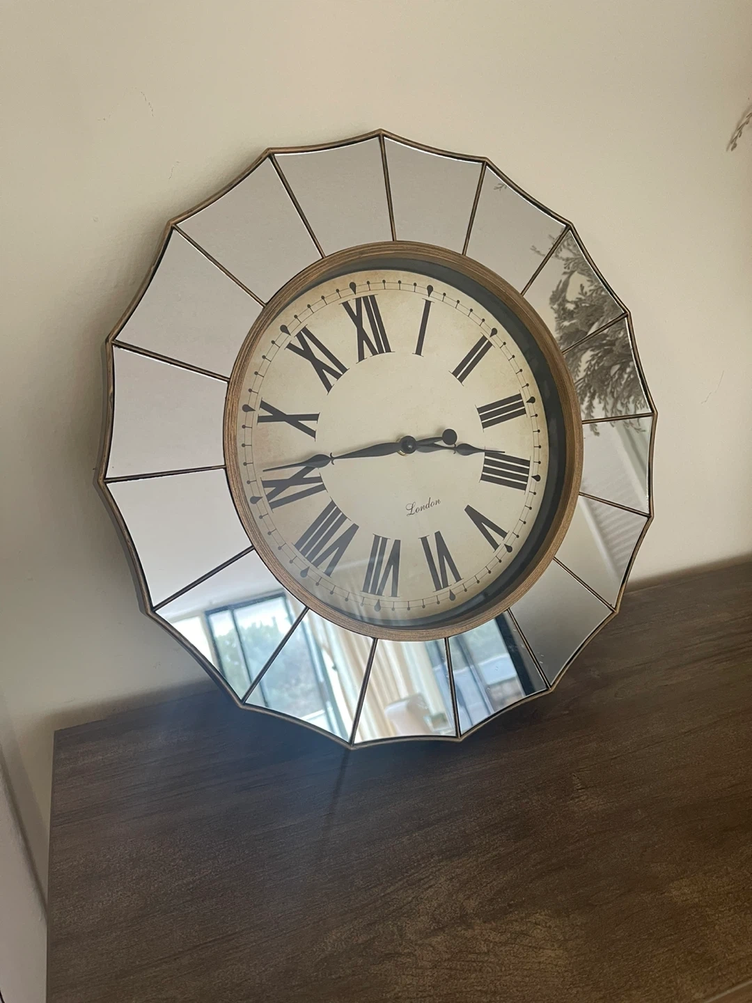 This striking wall clock features Roman numerals and a mirrored, sunburst-style bezel. The clock face reads 'London'. It's a decorative piece that tells time!