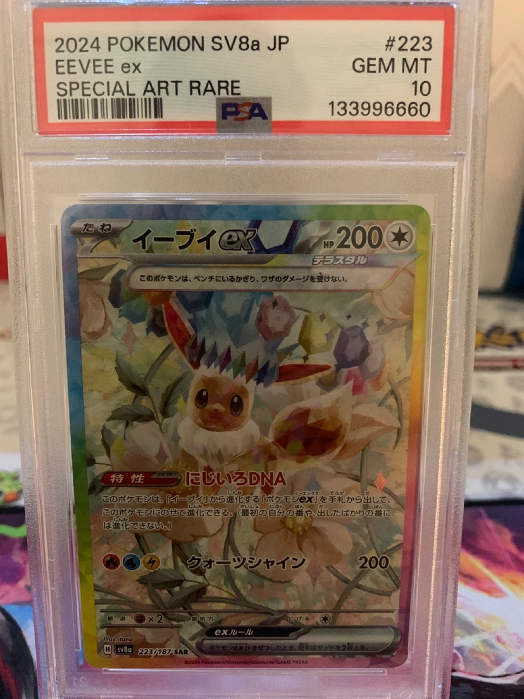 This is a 2024 Pokemon Eevee EX Special Art Rare card, graded PSA 10 GEM MT. It's the Japanese 223/187 SAR from the SV8a set.