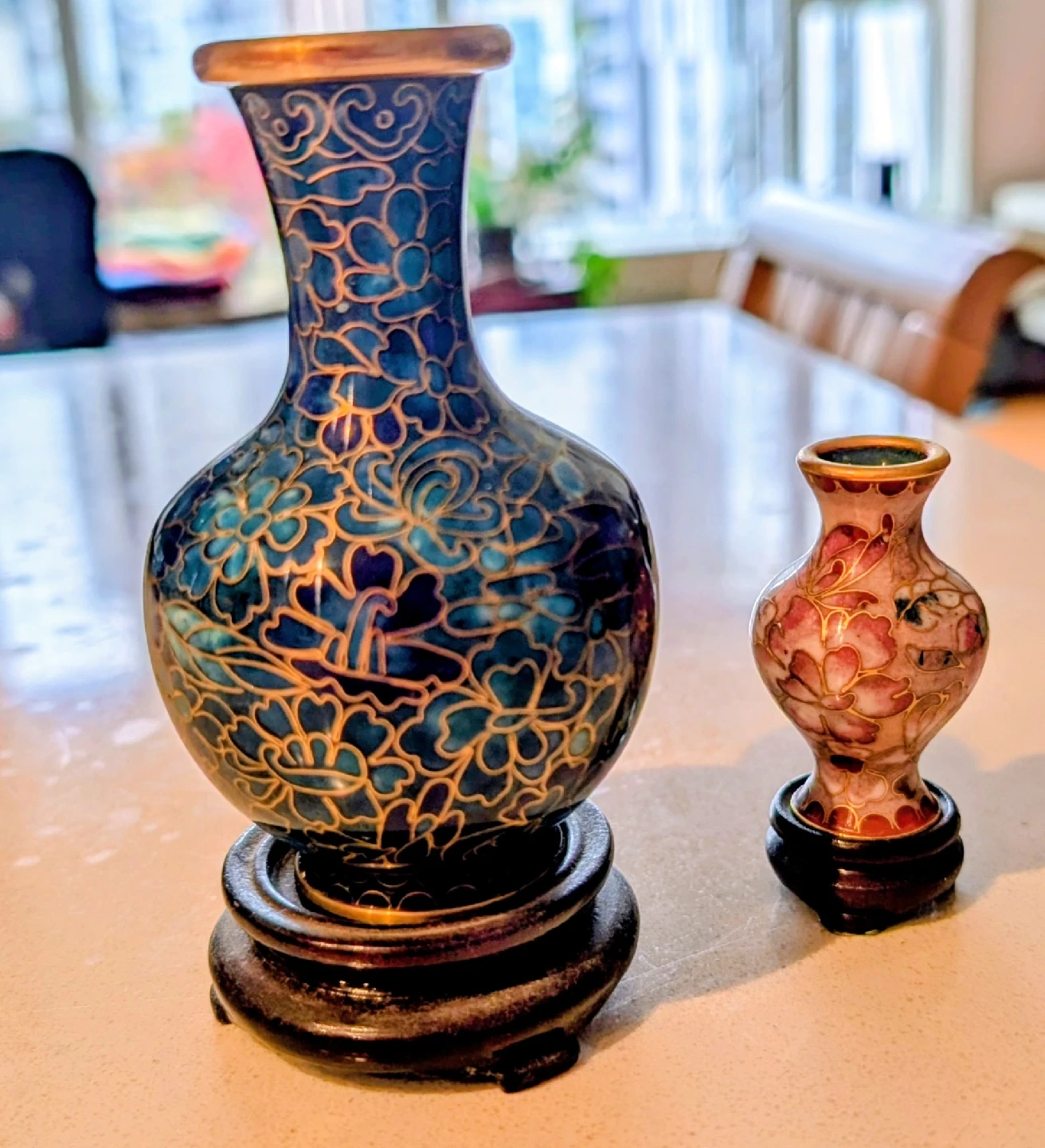 Selling a beautiful set of two cloisonné vases. They feature intricate floral designs and come with wooden stands. The larger vase has a striking blue colour, while the smaller one is a lovely pink. Perfect for adding a touch of elegance to any room!