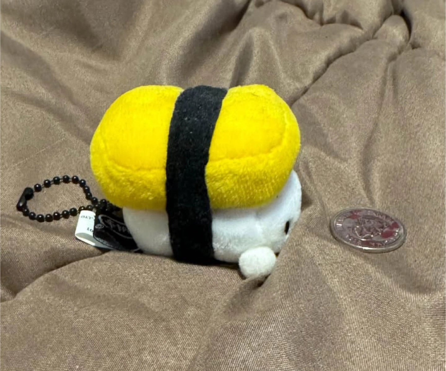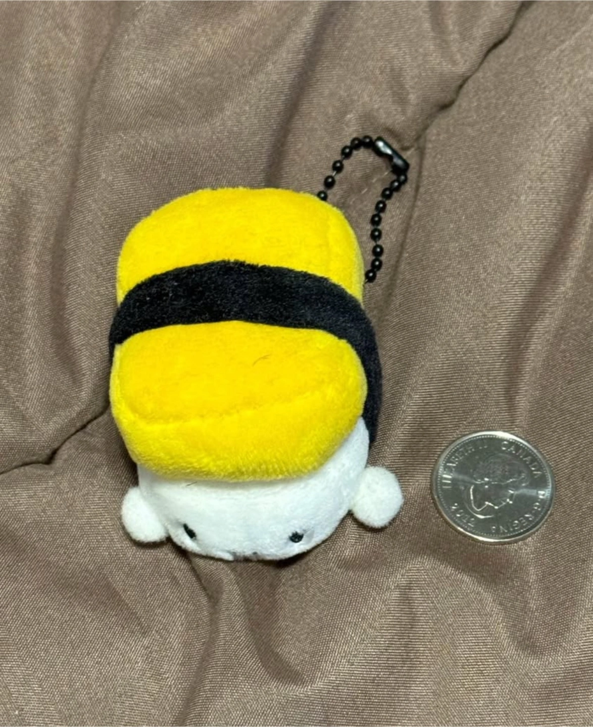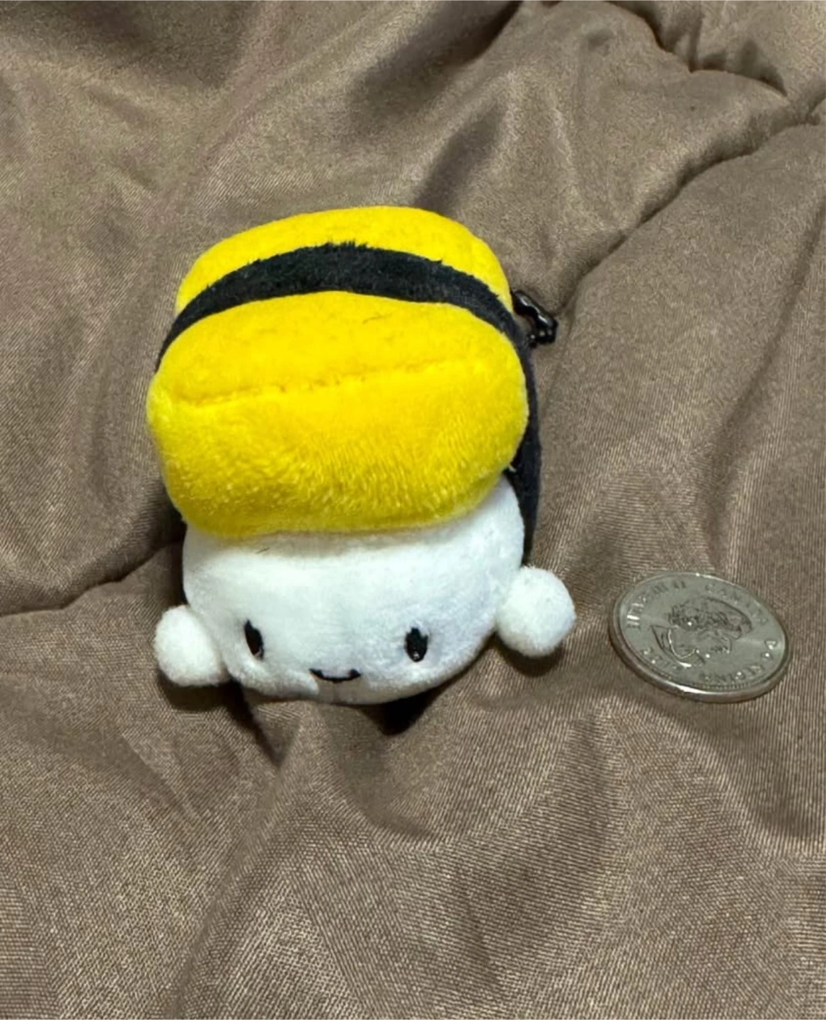Miniature plush tamagoyaki sushi keychain. Features a cute face. Small and collectible. Perfect for bags or keys.