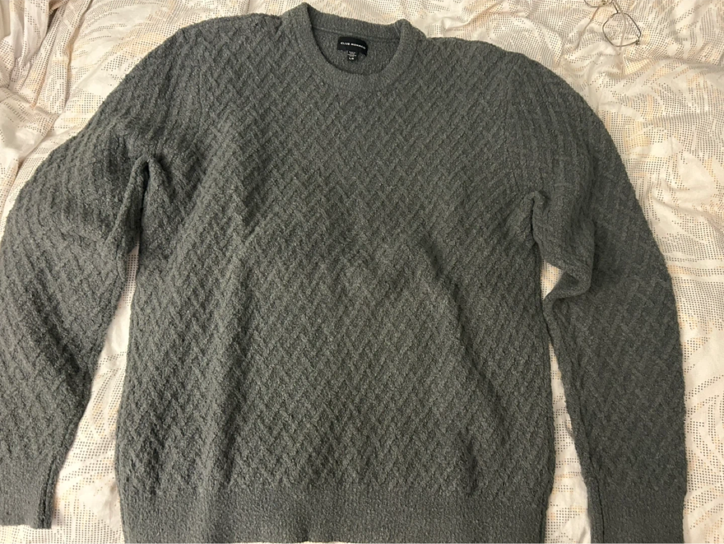 This Club Monaco sweater comes in a versatile dark green colour with a unique boucle textured knit pattern. It's a size large/g. This knit is perfect for layering when the weather cools down!