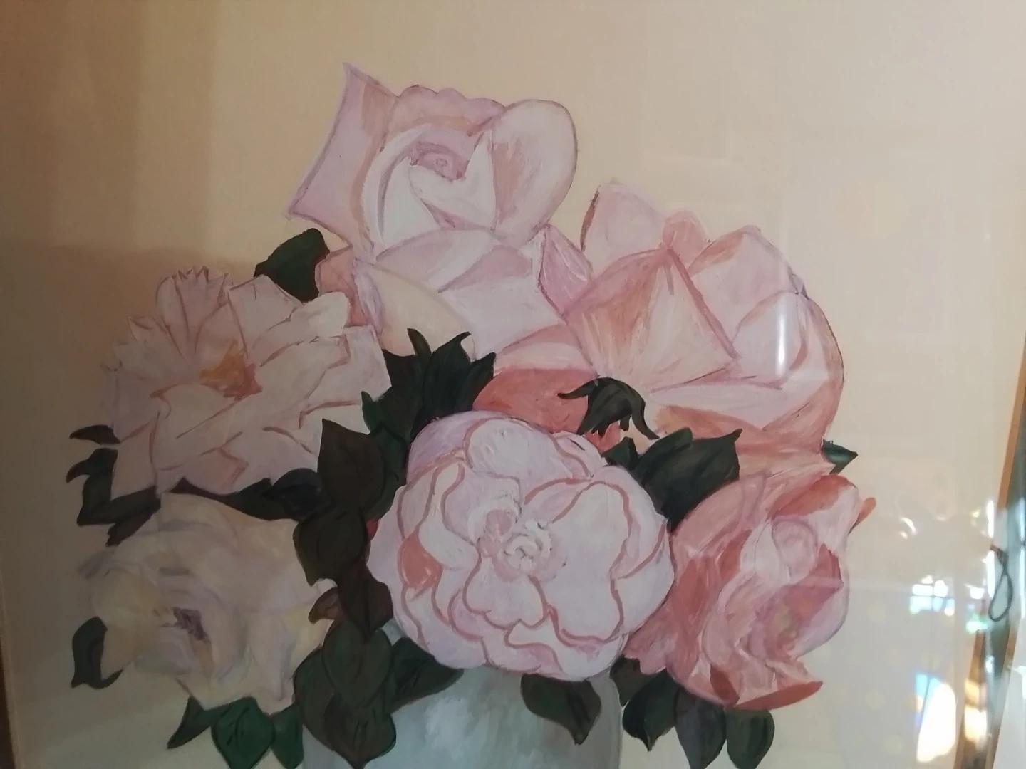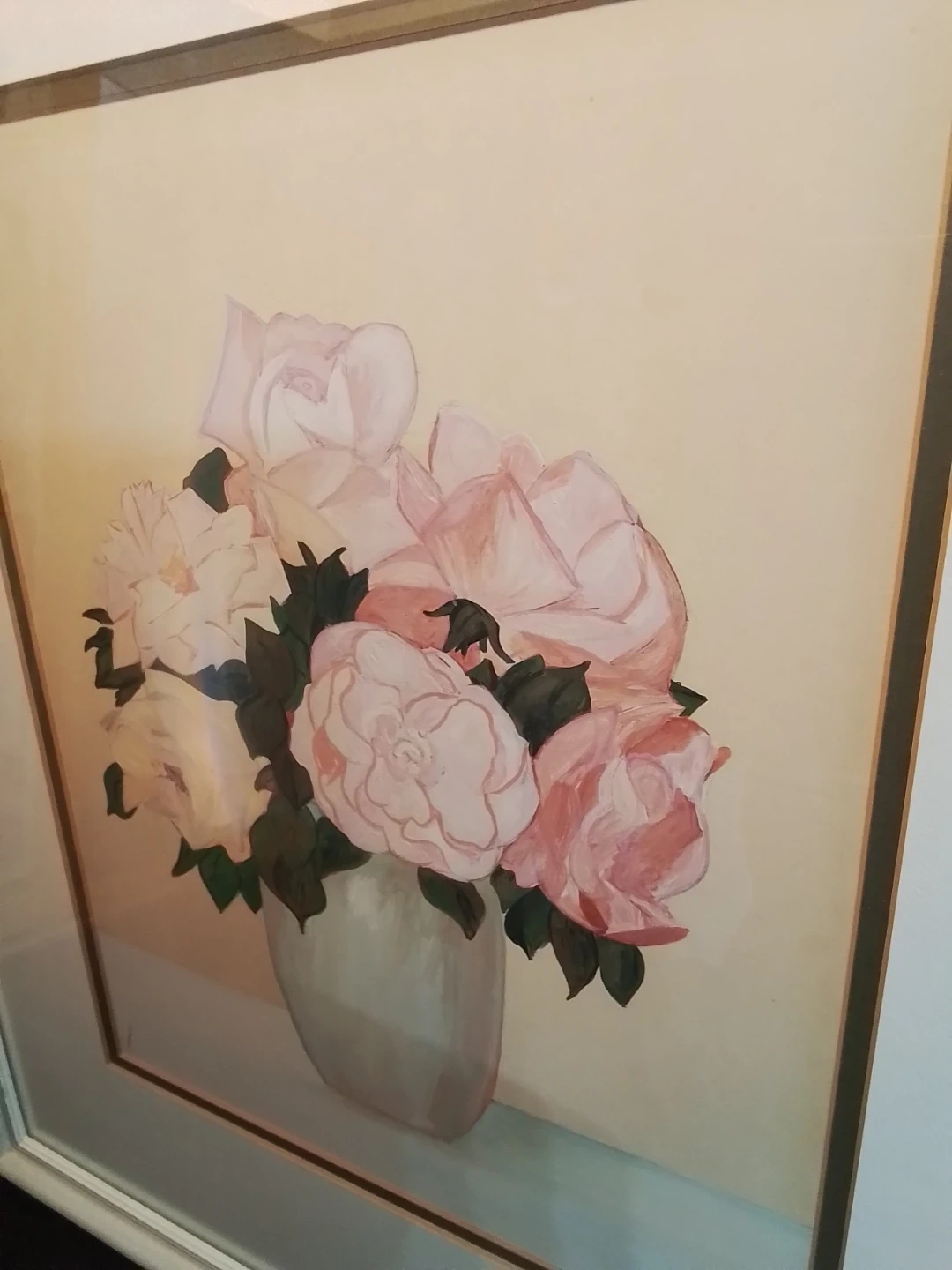 Framed painting of pink and white roses in a vase. The artwork is signed by S.A. Virro. It's ready to hang and would brighten up any room!