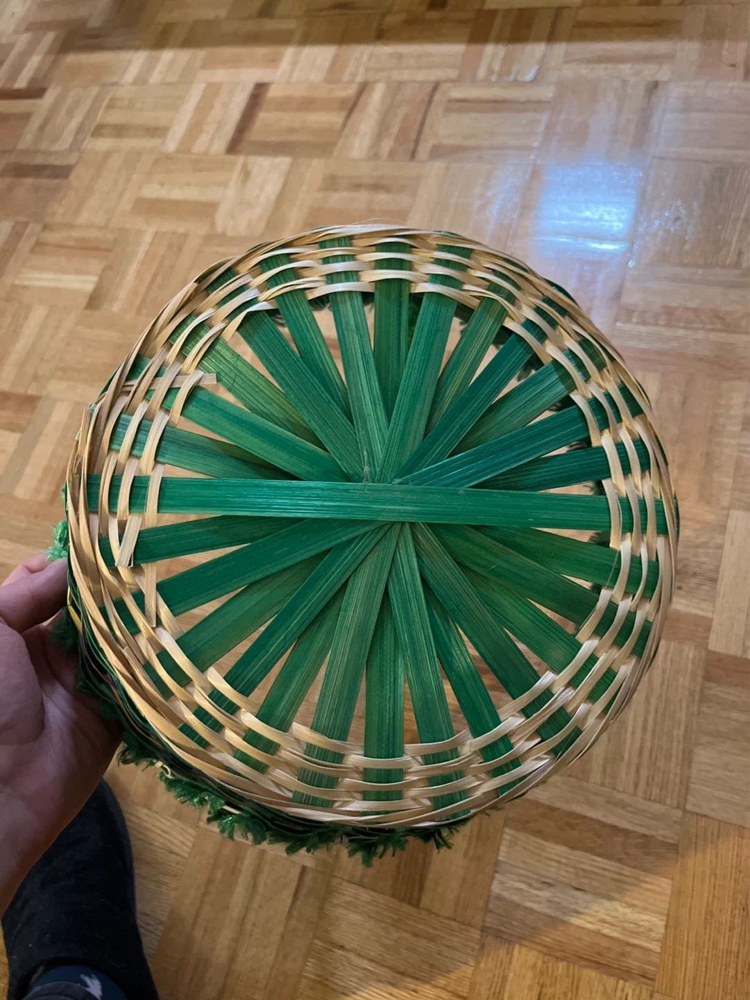 This decorative basket is woven from natural materials with green, yellow, and purple accents. It features a fluffy green trim around the rim and a matching green pipe cleaner handle. It's perfect for Easter egg hunts or holding small gifts!