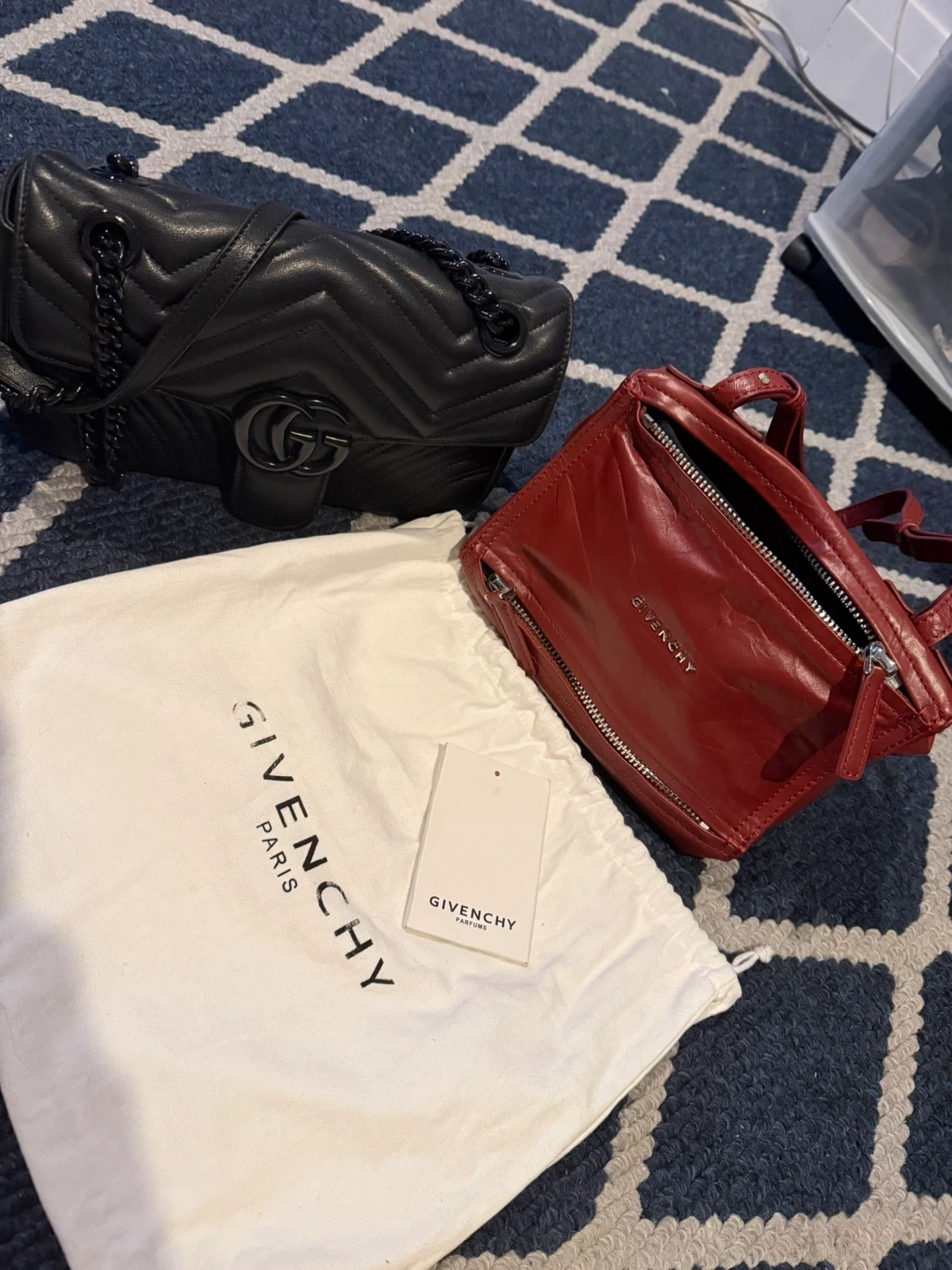 80$ for these two lovely bags❤️Includes a black chevron-quilted leather handbag with chain strap and a red leather crossbody bag. Both bags are made of genuine leather. The black bag has a GG logo, and the red bag has Givenchy branding.