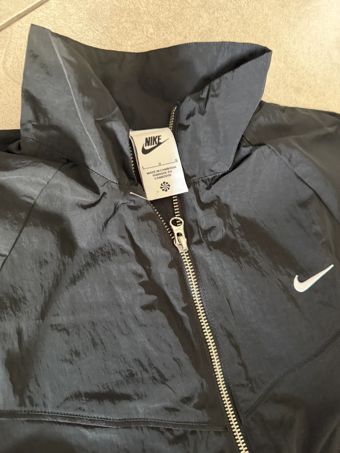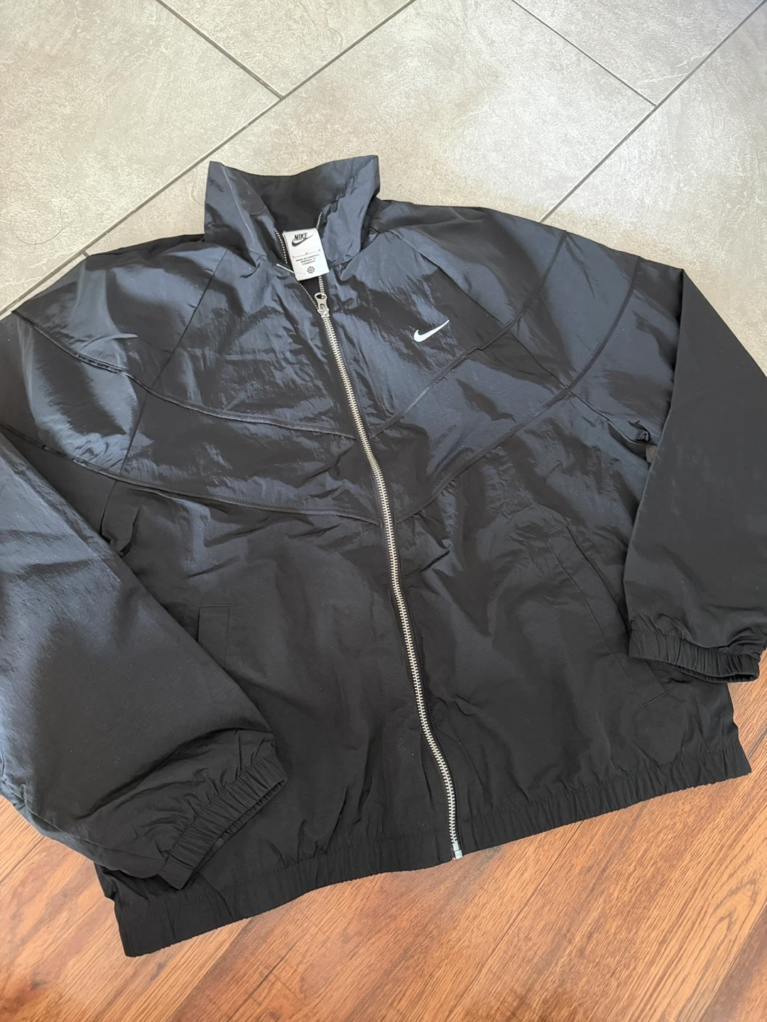Black Nike windbreaker jacket with a full zip front. It's lightweight and perfect for everyday wear. Features the iconic Nike swoosh logo.