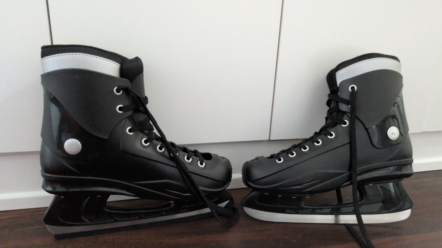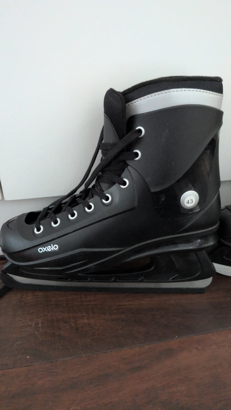Black Oxelo ice skates in size 43. They feature metal blades and laces for a secure fit. Basically new, have only been used once or twice. In excellent condition.