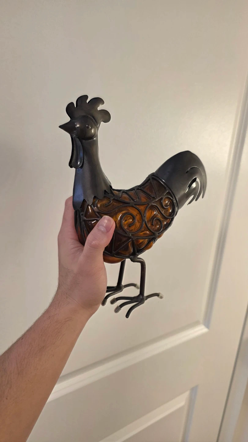 Decorative wine bottle holder shaped like a rooster. It features a dark metal frame with amber glass accents. This unique piece adds a rustic charm to any kitchen or dining area.