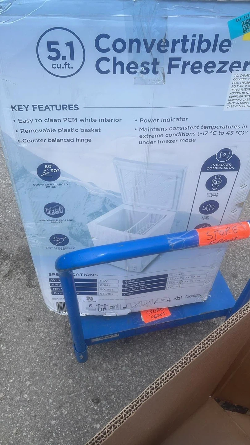 This is a 5.1 cu.ft. convertible chest freezer with an easy-to-clean white interior and a removable basket. It features a counter-balanced hinge and maintains consistent temperatures even in extreme conditions. The freezer is white and has inverter compressor technology.