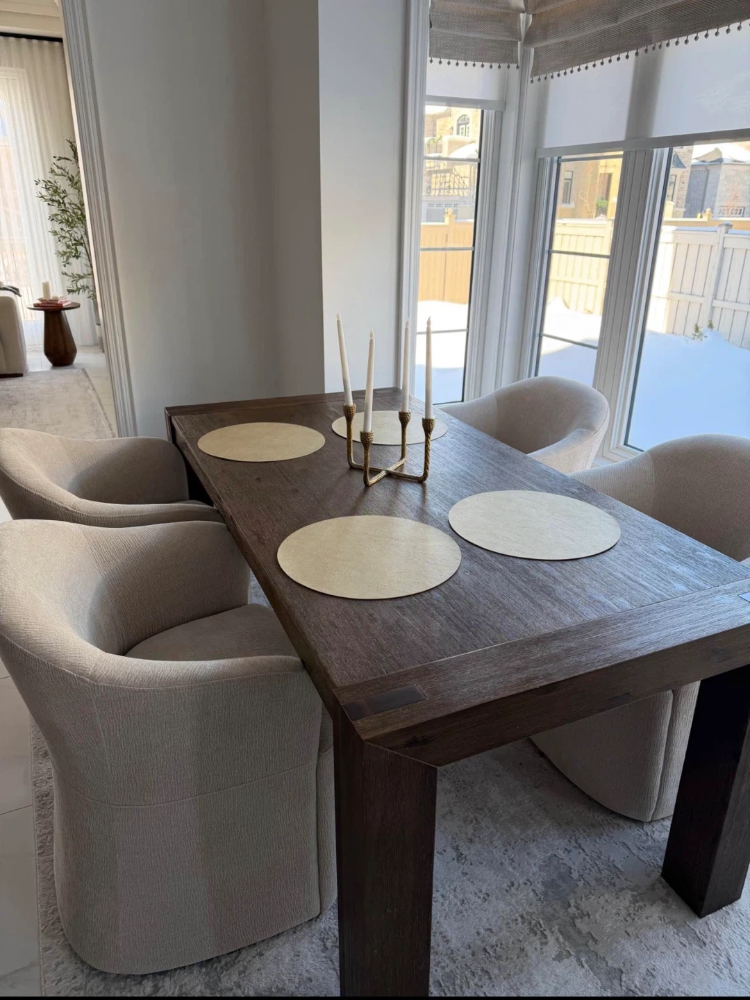 Modern dining set up for grabs. Dark wood rectangular table. Four comfy upholstered chairs in light neutral fabric. Great for family meals or entertaining. Everything in super good shape.