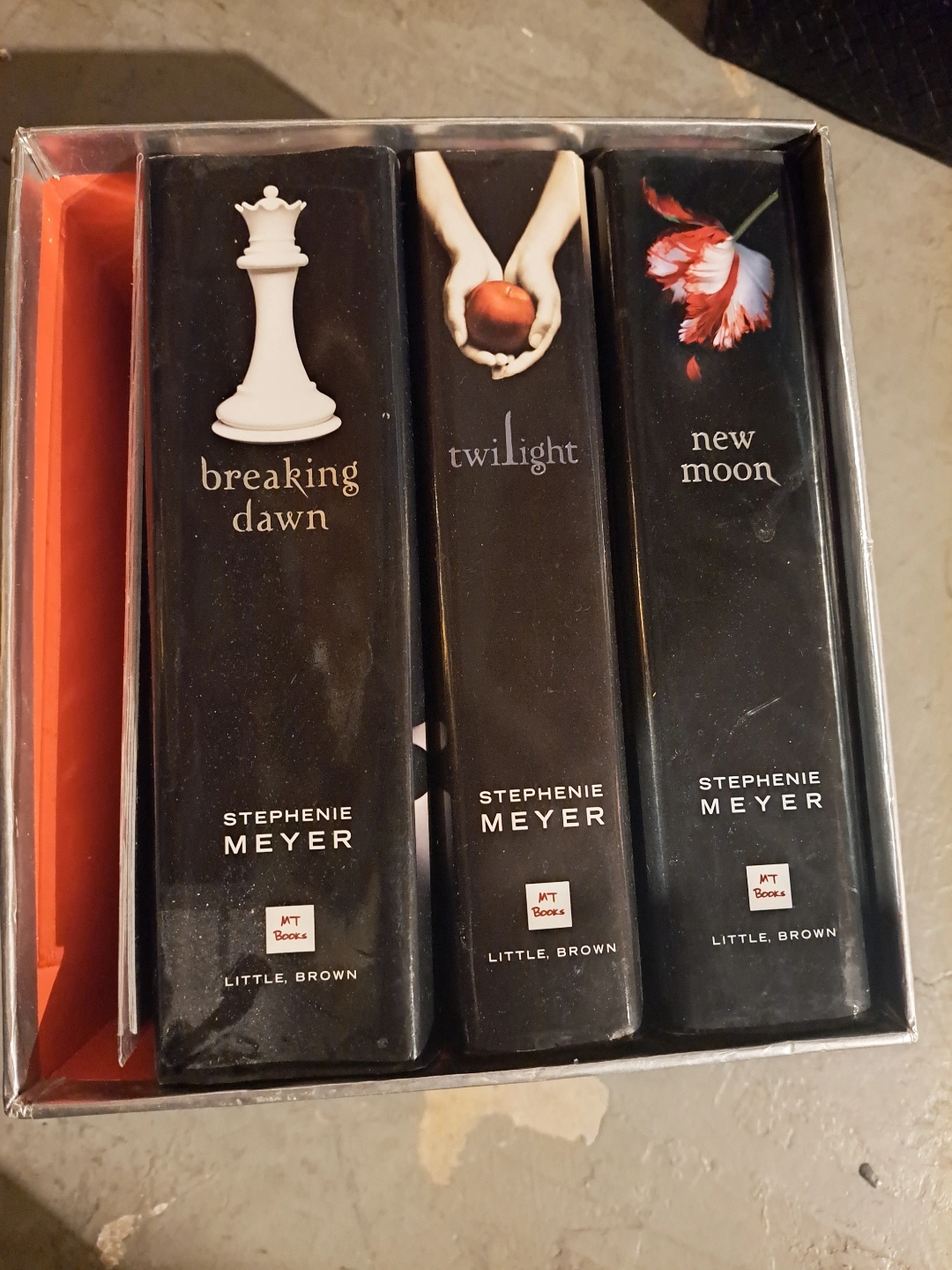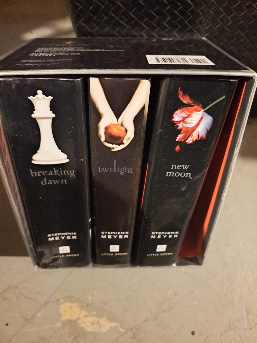 This box set includes the first three books in Stephenie Meyer's Twilight Saga: Twilight, New Moon, and Breaking Dawn.