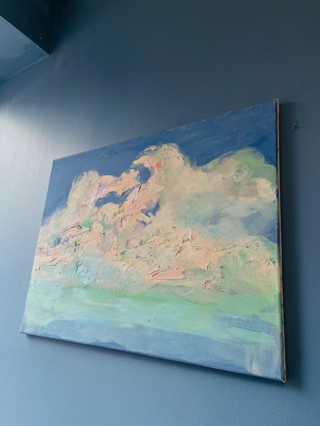 Canvas art featuring a textured, abstract painting of clouds. Vibrant blues, whites, and pastel pinks and greens. Oil or acrylic medium on canvas. 18 x 24 ”