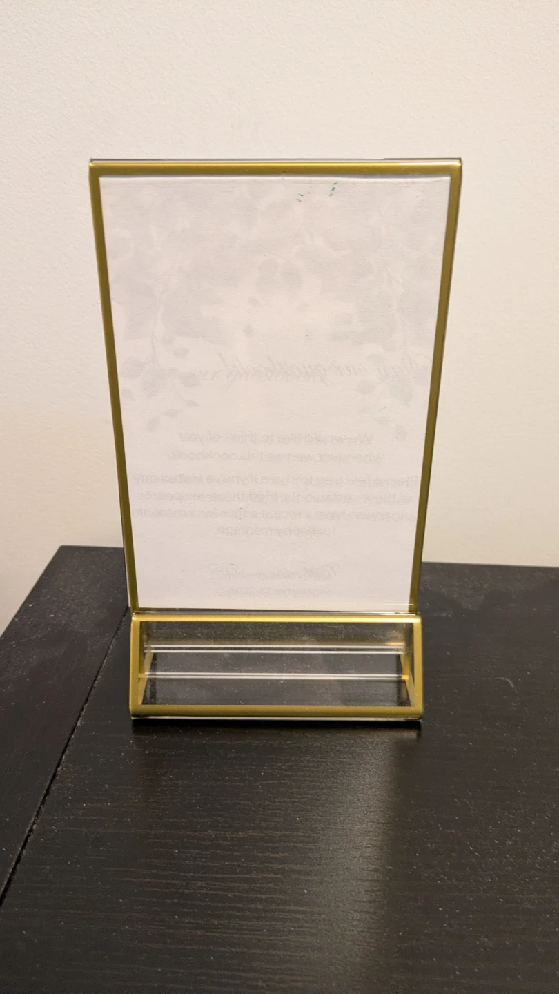 Selling a set of 21 gold table number holders. They are perfect for weddings, bridal or baby showers, parties, or other events where you need to dslisplay table numbers or names. We used them to display QR codes for our digital wedding photo guestbook.