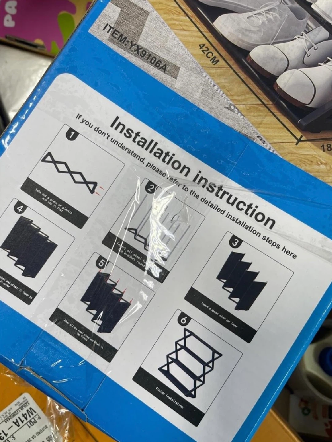 This is a 4-tier shoe rack, measuring 42cm wide, 18.5cm deep, and 49.5cm high. It's made of plastic and can accommodate boots by removing a layer. This organizer is useful for keeping hallways and closets tidy.