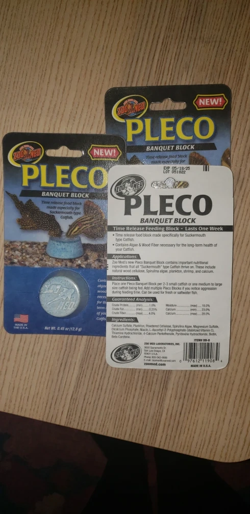 Zoo Med Pleco Banquet Block - Time Release Fish Food $5 obo worth $17 DESCRIPTION Feed your fish in healthy fashion with this Zoo Med Pleco Block Fish Food. This time-release food block is made with algae and wood fiber, which aid in the long-term health in suckermouth-type fish. This block may also be used for supplemental feeding for difficult feeders, as well as vacation feeding for both fresh or saltwater fish. Key Benefits: Time Release food block made especially for sucker-mouth type Catfish Contains algae and wood fiber necessary for the long term health of your Catfish Time release food block is great as a vacation feeder Great supplemental food source for difficult feeders Provides an opportunity for bottom feeders to wear mouth parts naturally