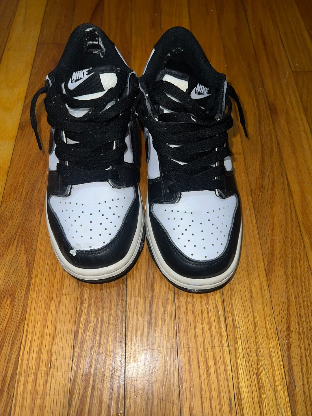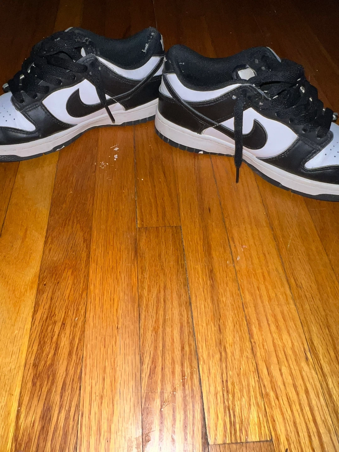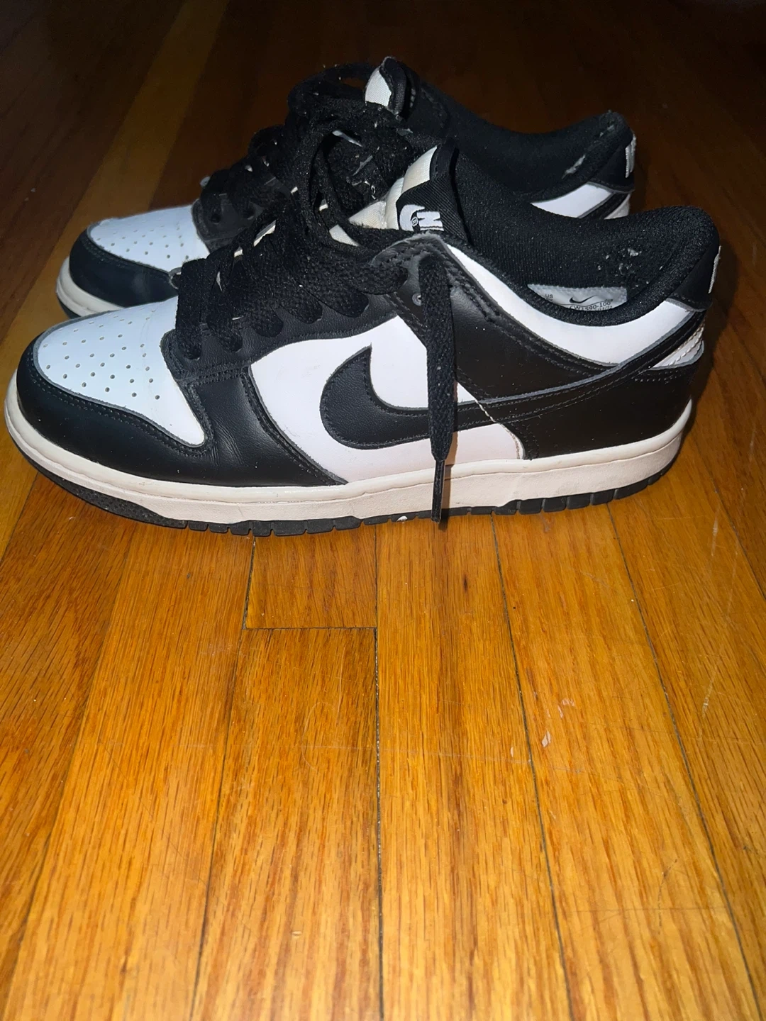 A pair of Nike Dunk Low sneakers in a classic black and white colourway. These shoes are made with a leather upper and rubber sole for durability. Perfect for everyday wear!