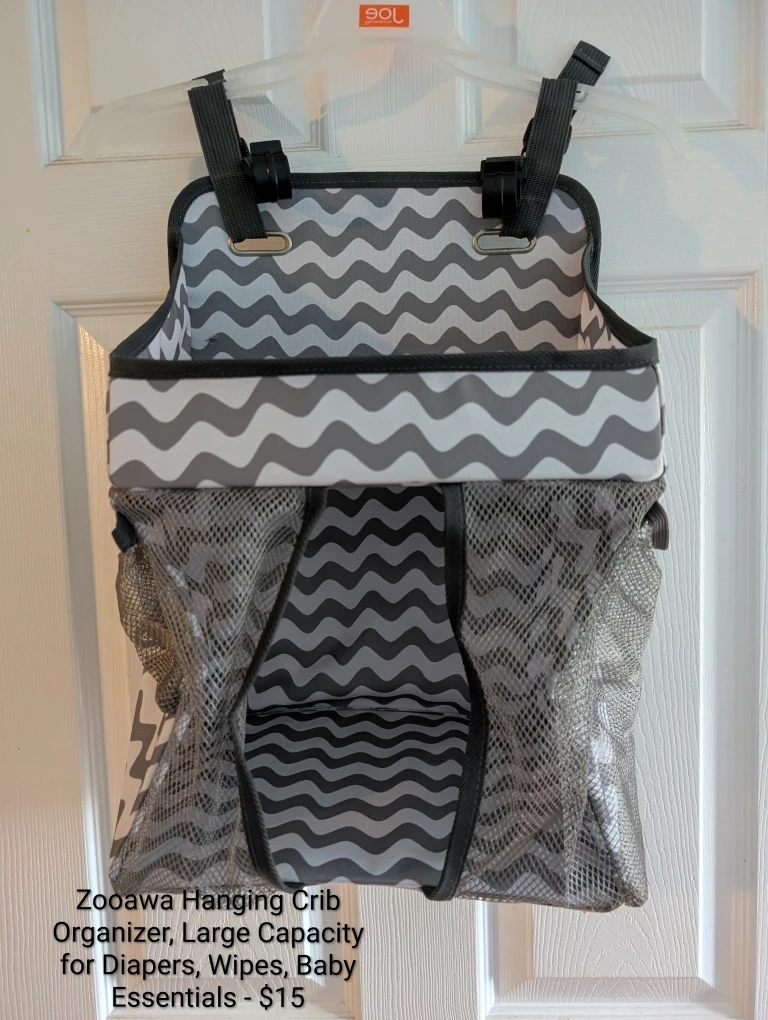 60Keep all your baby essentials organized with this Zooawa hanging crib organizer! It has a large capacity for diapers, wipes, and other baby necessities. The grey and white chevron pattern will look great in any nursery