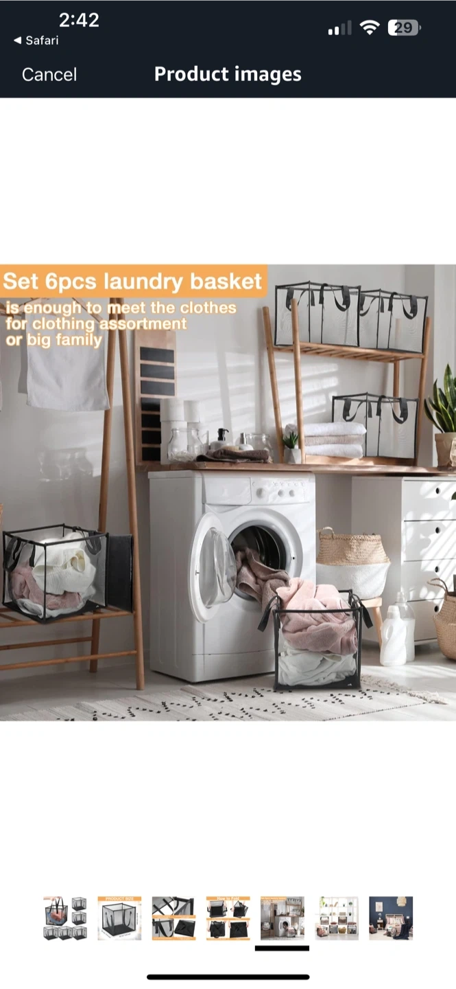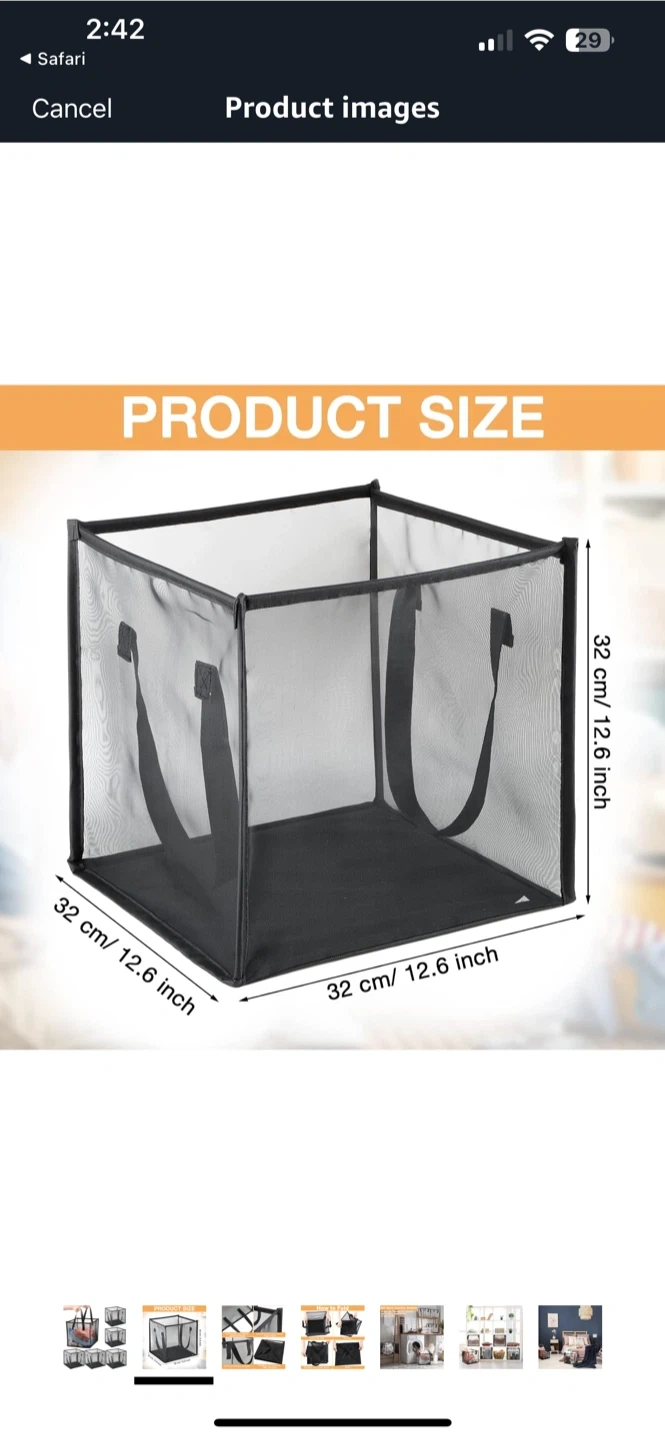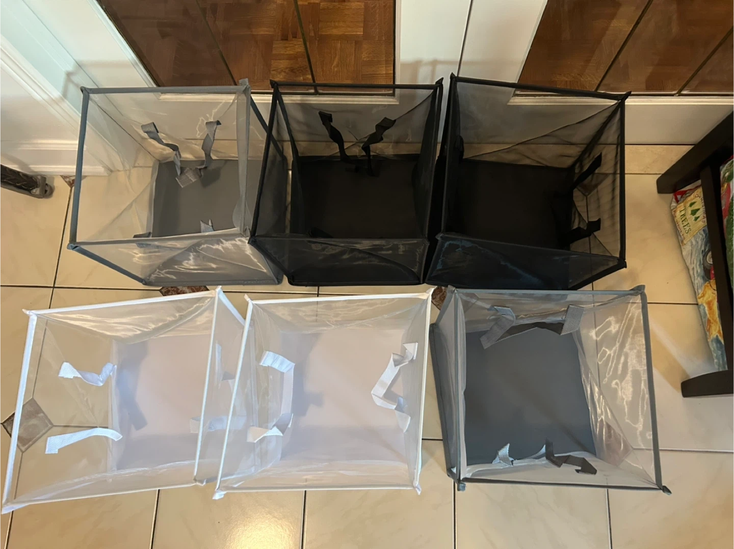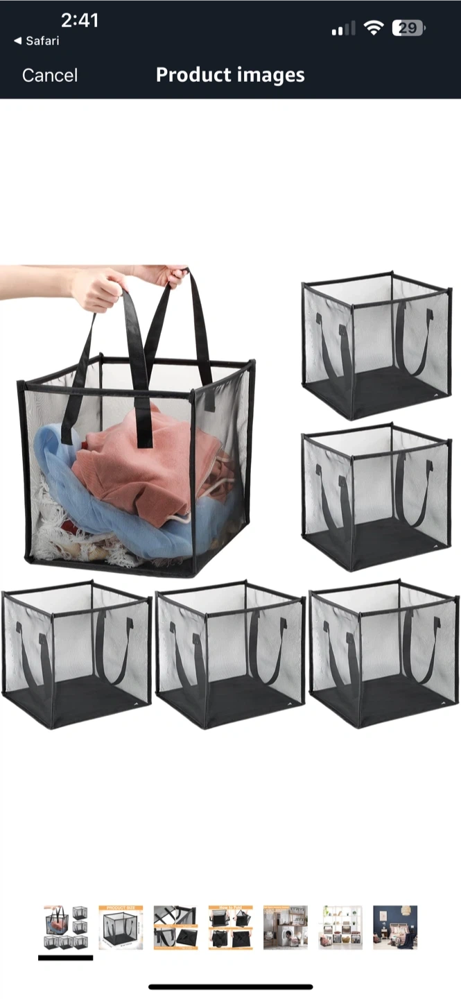 This set of 6 laundry baskets is perfect for organizing clothes for the whole family! They're designed with convenient and sturdy widened handles, plus exquisite stitching without rough edges. The cross stitching is stronger, and they're foldable so they don't take up space. Each basket is 32cm/12.6 inches. They are brand new and the colours in the pack are : 2 grey, 2 black, 2 white . I opened the pack to show how they look opened