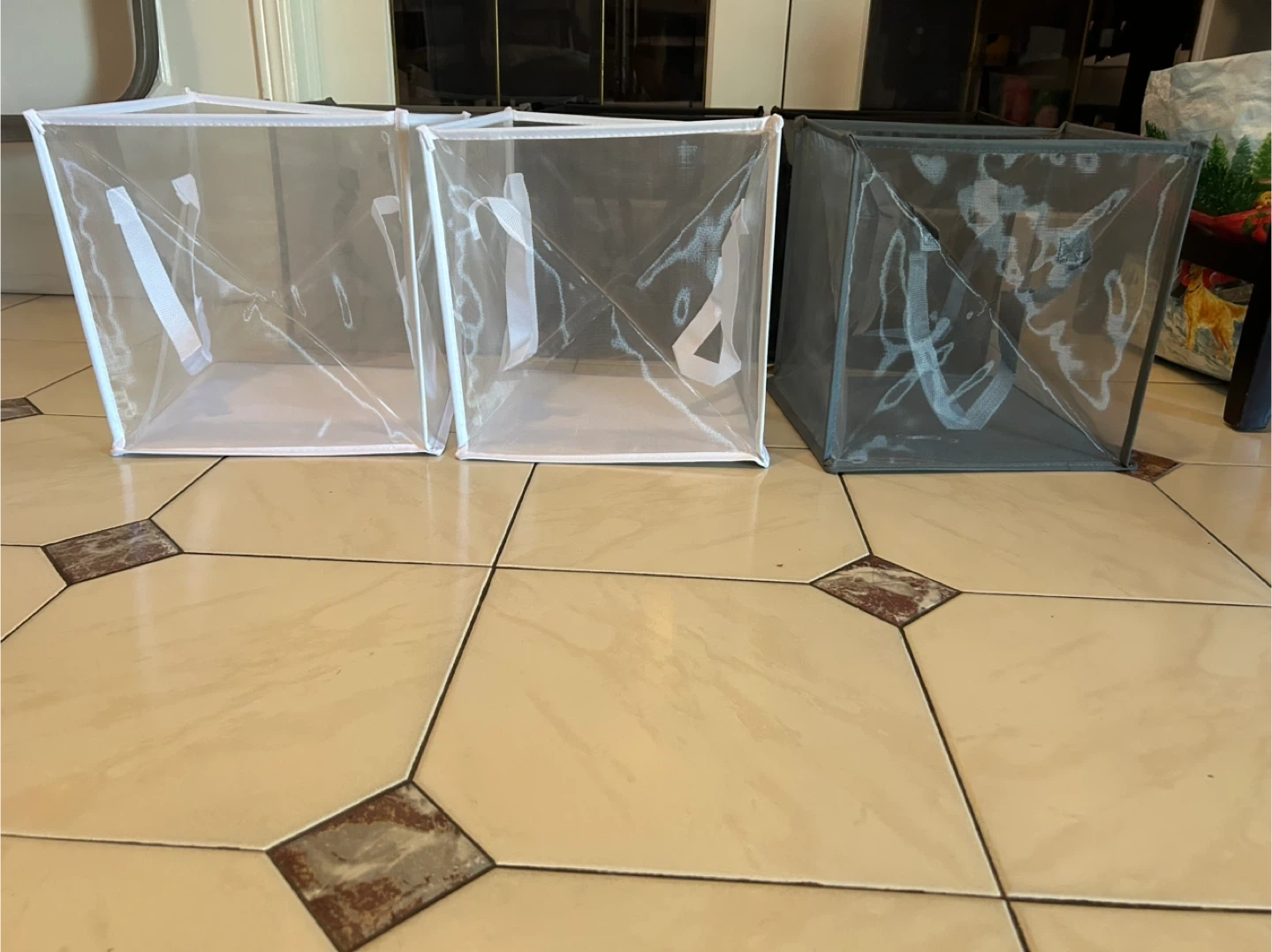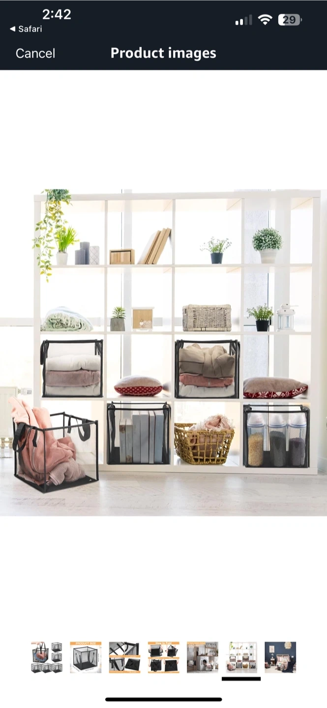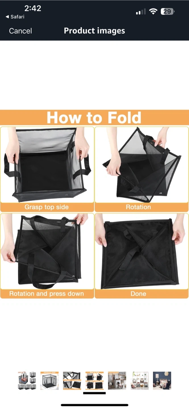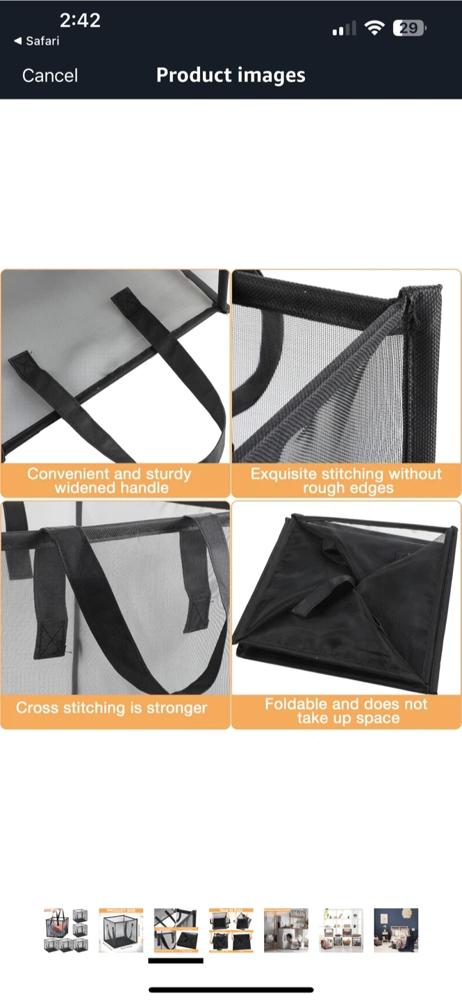 This set of 6 laundry baskets is perfect for organizing clothes for the whole family! They're designed with convenient and sturdy widened handles, plus exquisite stitching without rough edges. The cross stitching is stronger, and they're foldable so they don't take up space. Each basket is 32cm/12.6 inches. They are brand new and the colours in the pack are : 2 grey, 2 black, 2 white . I opened the pack to show how they look opened
