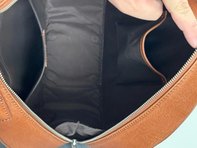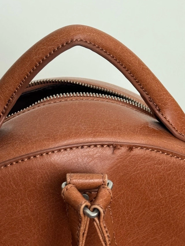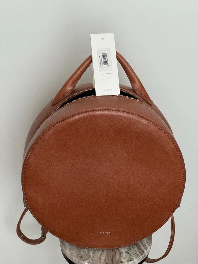 This is the Matt & Nat Kiara Bag in Chili colour. A structured round backpack with adjustable straps and a main zipper closure. Interior: zipper pocket, smartphone pocket, logo-embossed Vintage patch. 100% recycled nylon lining. Adjustable Shoulder Straps: 32" Fully extended. Handle Drop: 2.5". All of the interior linings of our bags are made from 100% recycled plastic bottles. Note the fraying on the handle. Details: WDH 12" x 12" x 4". Wellesley & Sherbourne Pickup Only. MSRP $160. Vegan and cruelty-free.
