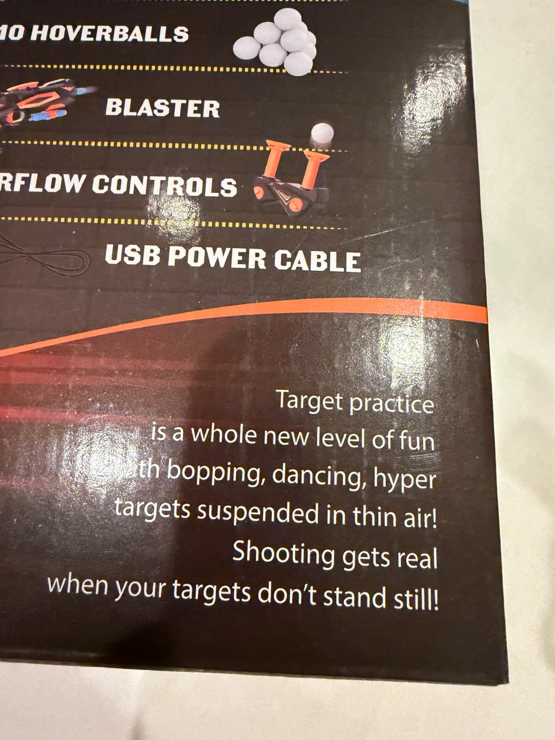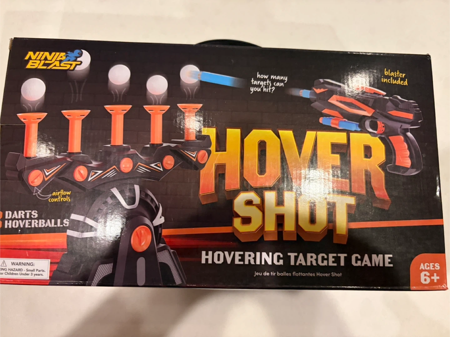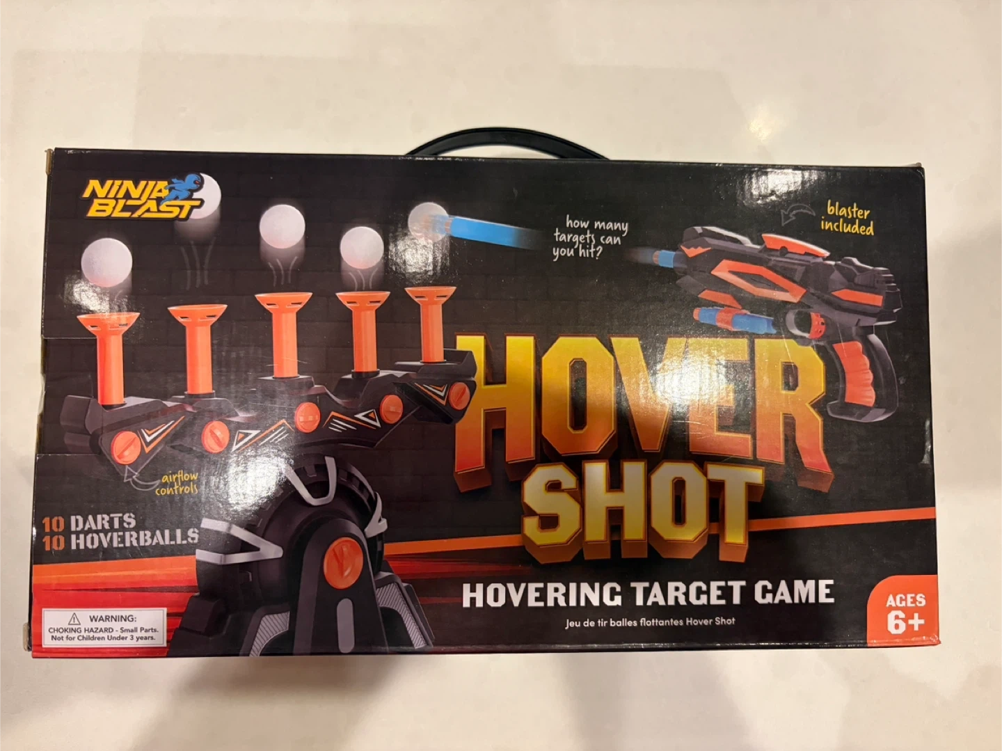 This is a Ninja Blast Hover Shot hovering target game! It's suitable for ages 6 and up. It includes 10 darts and 10 hoverballs. The blaster is also included! This is a fun game for kids and adults alike.