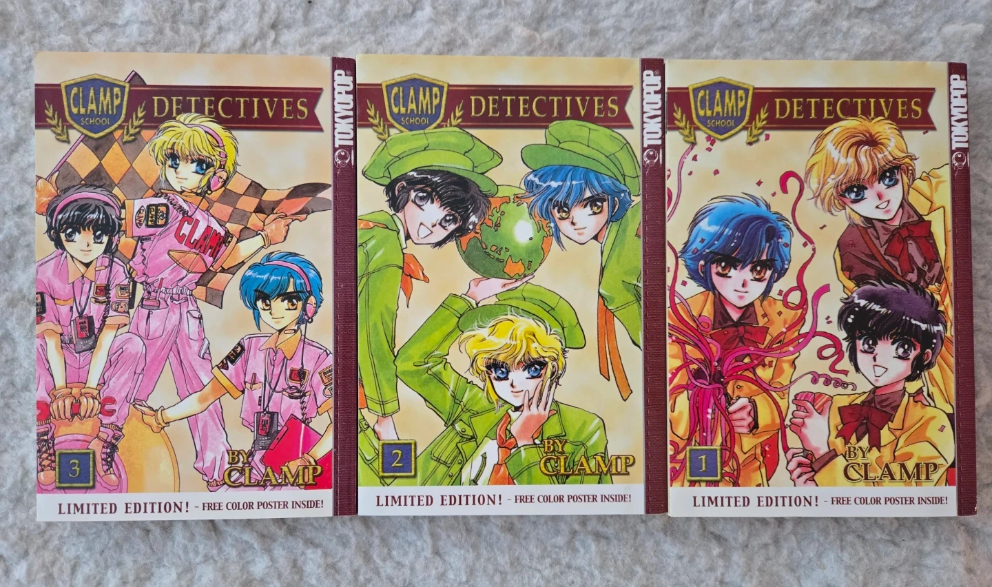 This is a set of three Clamp School Detectives manga volumes. They're written by Clamp and published by Tokyopop. Each volume includes a free color poster inside!