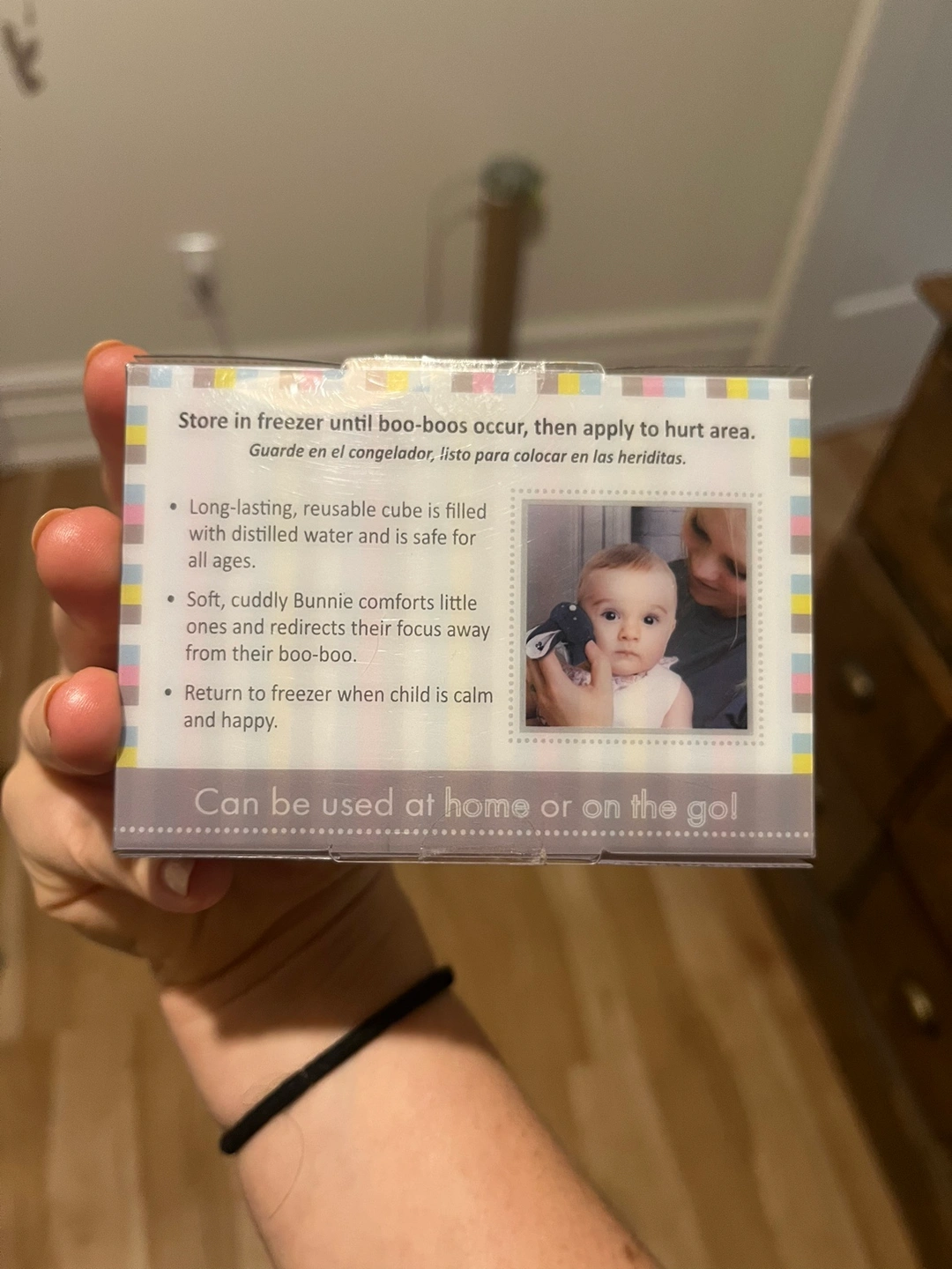 Pink plush bunny with a cold pack that can be used to soothe bumps and bruises. New in package. Package is a bit damaged but never been opened or used.