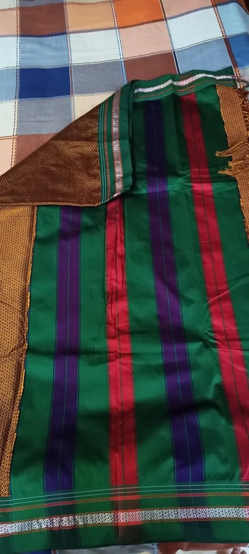 A beautiful woven saree with a rich brown base and a vibrant green border. It features intricate patterns and colourful striped pallu. Perfect for special occasions or cultural events!