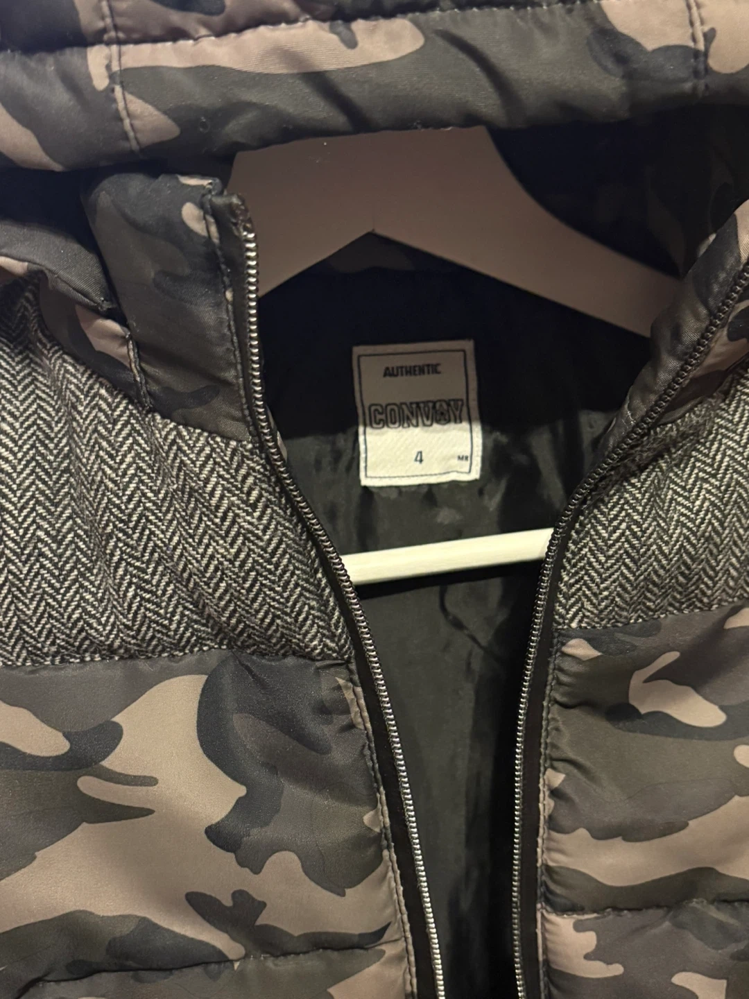 This is a kids’ winter puffer jacket with a camouflage pattern. Size: 4 years