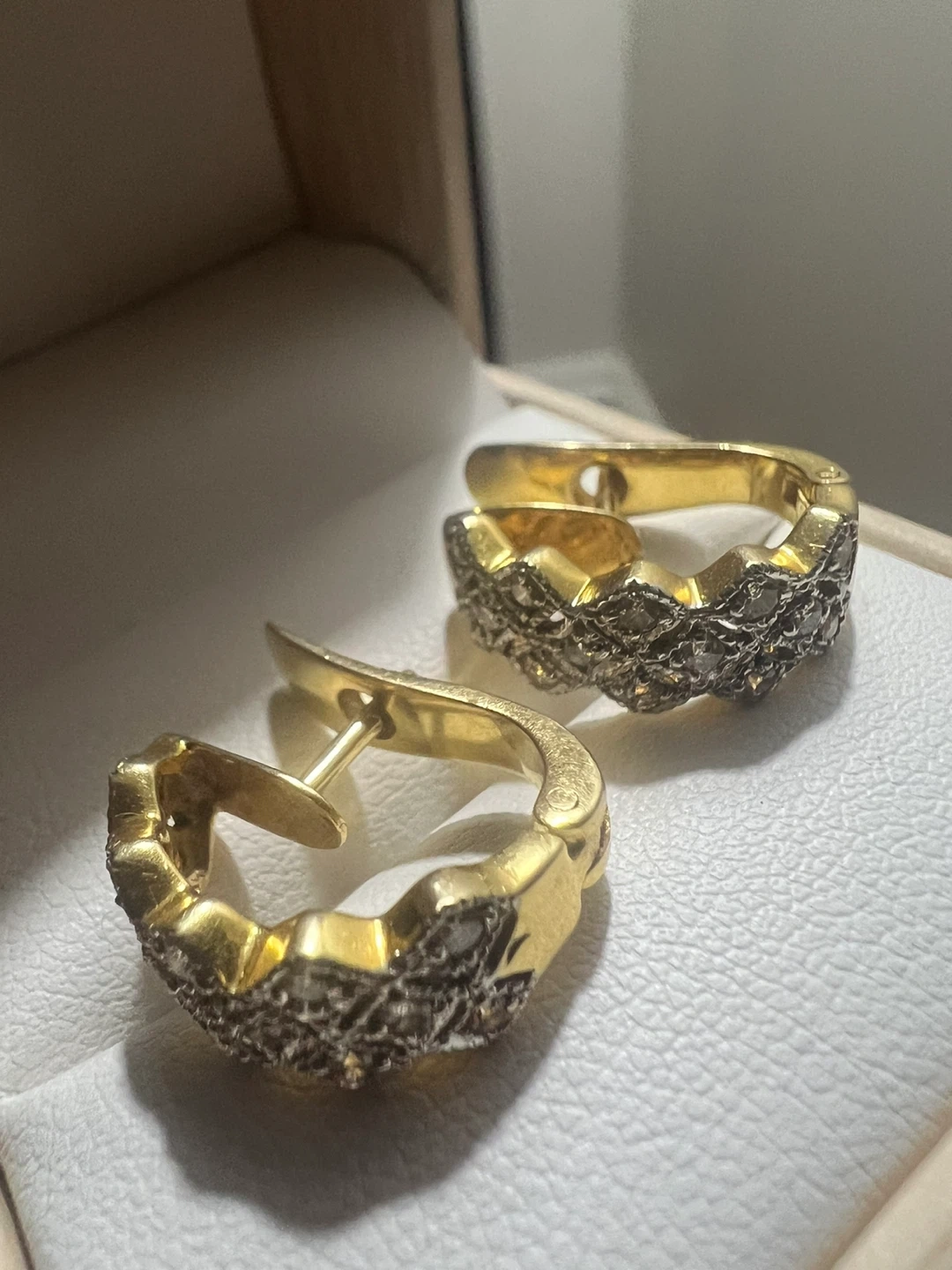 Elegant 14 k gold hoop earrings adorned with sparkling diamonds. These earrings add a touch of class to any outfit. They're perfect for a night out or a special occasion!