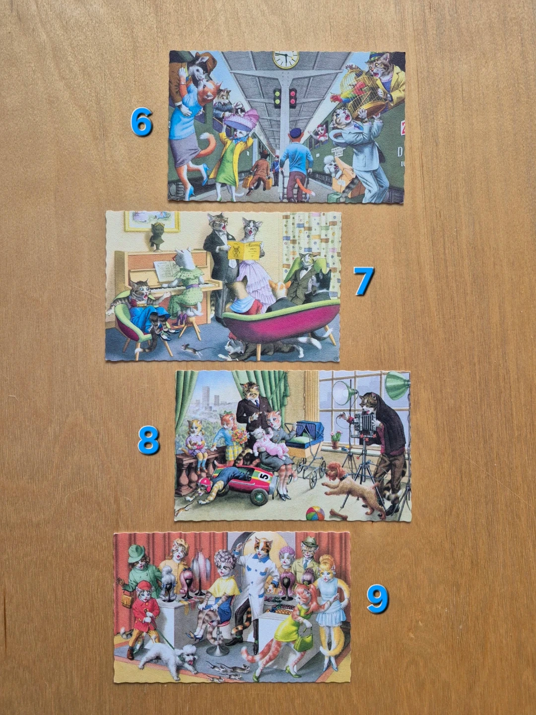 9 different designs available. These whimsical cards feature cats all dressed up in period costumes, riotously pursuing leisure activities. Full of complex detail, many have a sense of impending disaster, a simple event unravelling into a cascade of errors.