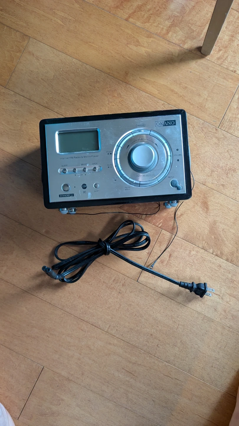 This OKANO TR 2608I is an internet and FM radio and media player. It supports AC 100-240V input and has a max power consumption of 16.8 Watt. Power cord is included.