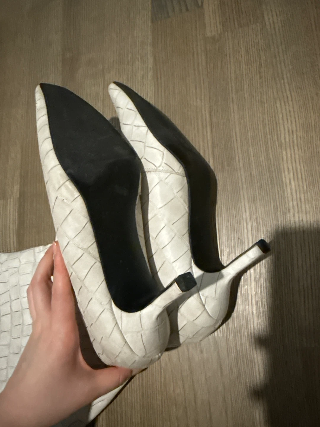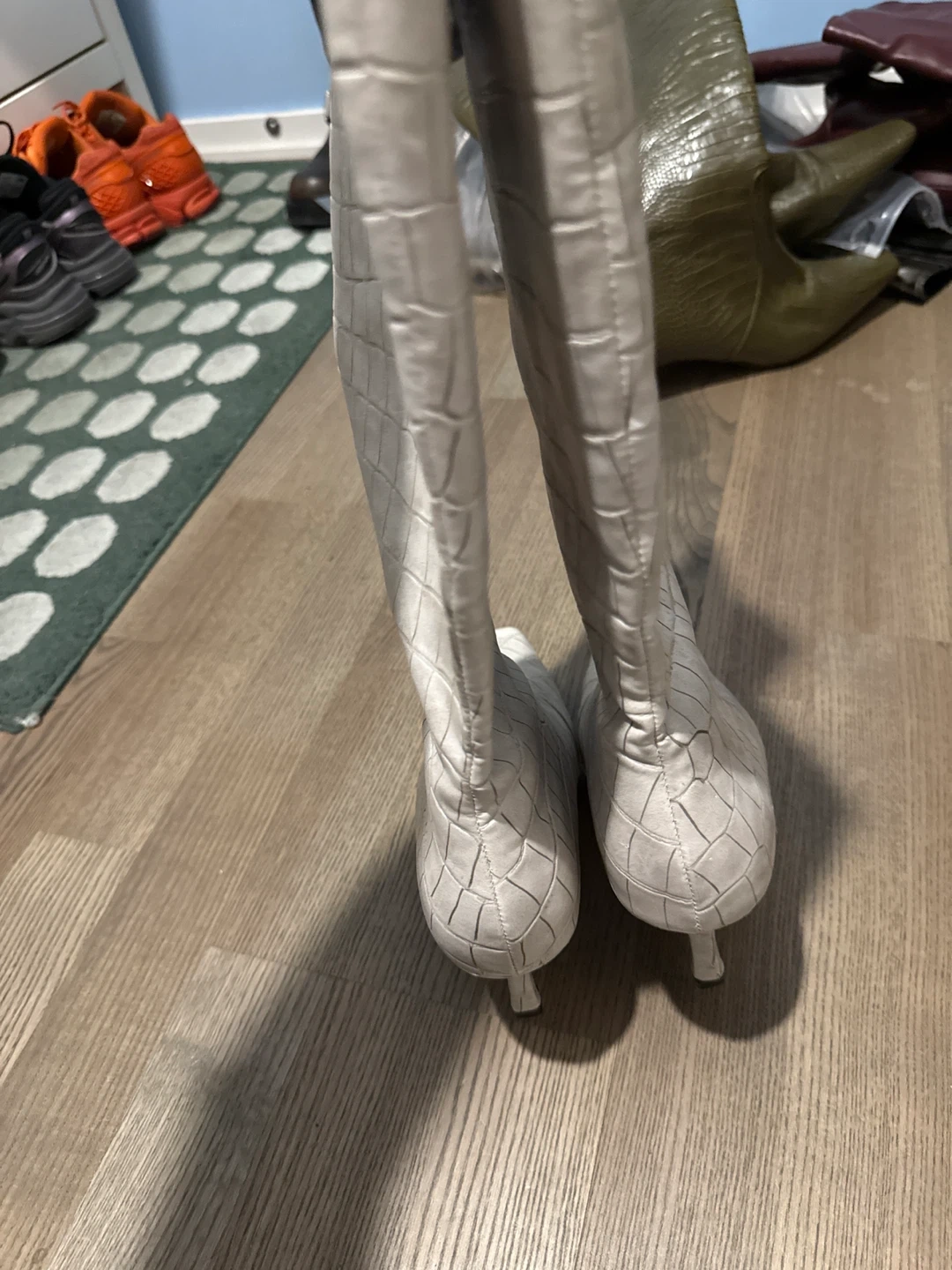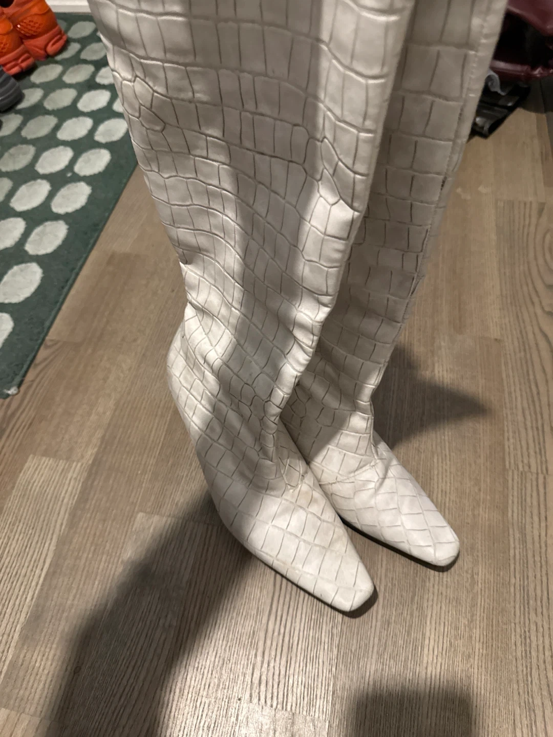 White knee-high boots with a faux crocodile texture and a pointed toe. Features a kitten heel and a pull-on style. These boots would add a stylish touch to any outfit.