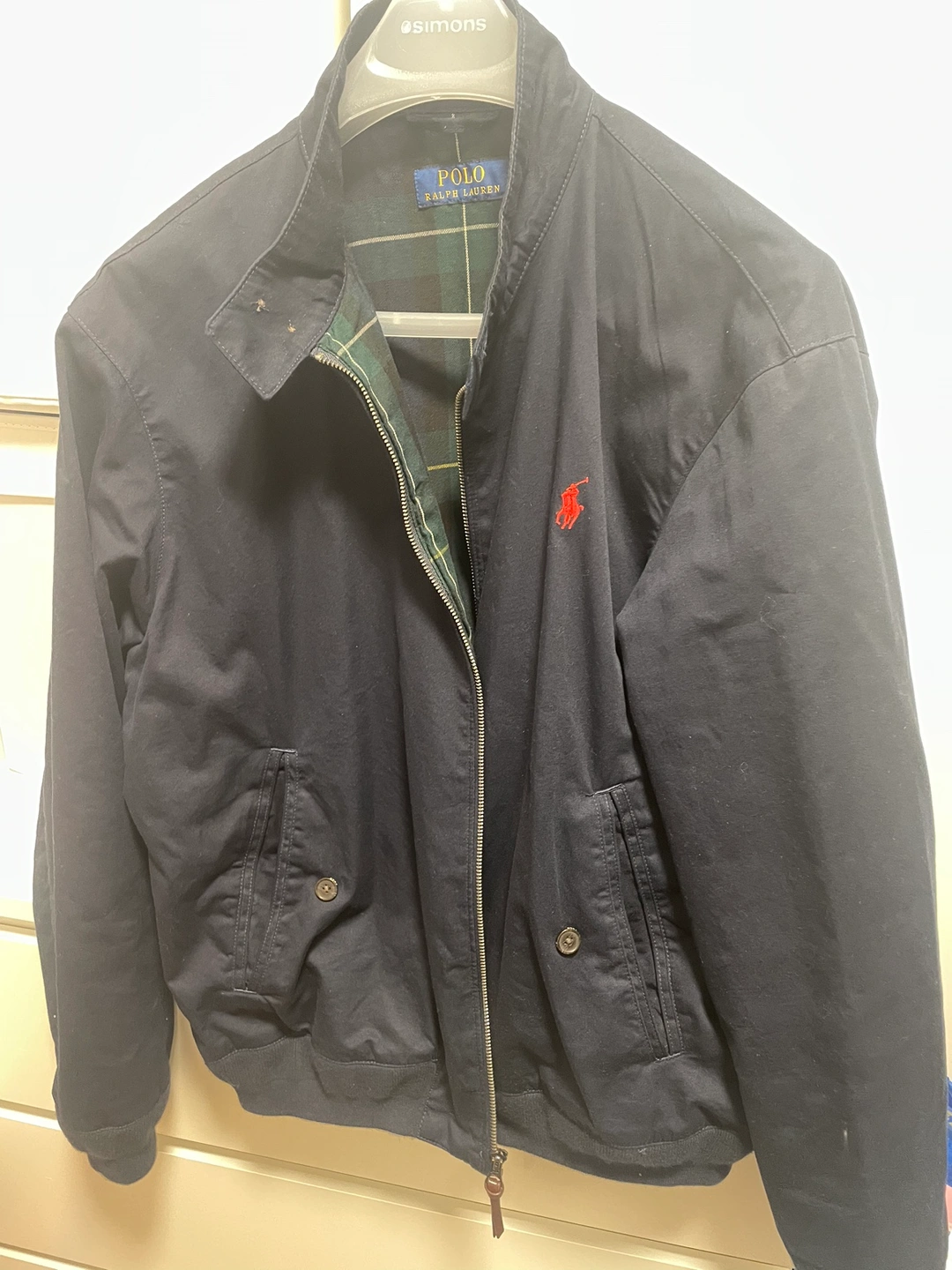 Navy blue jacket with plaid lining and a red Polo logo. Zipper closure almost new. Only worn couple times. Please do not waste my time, open to meet downtown, brentwood or Vancouver.