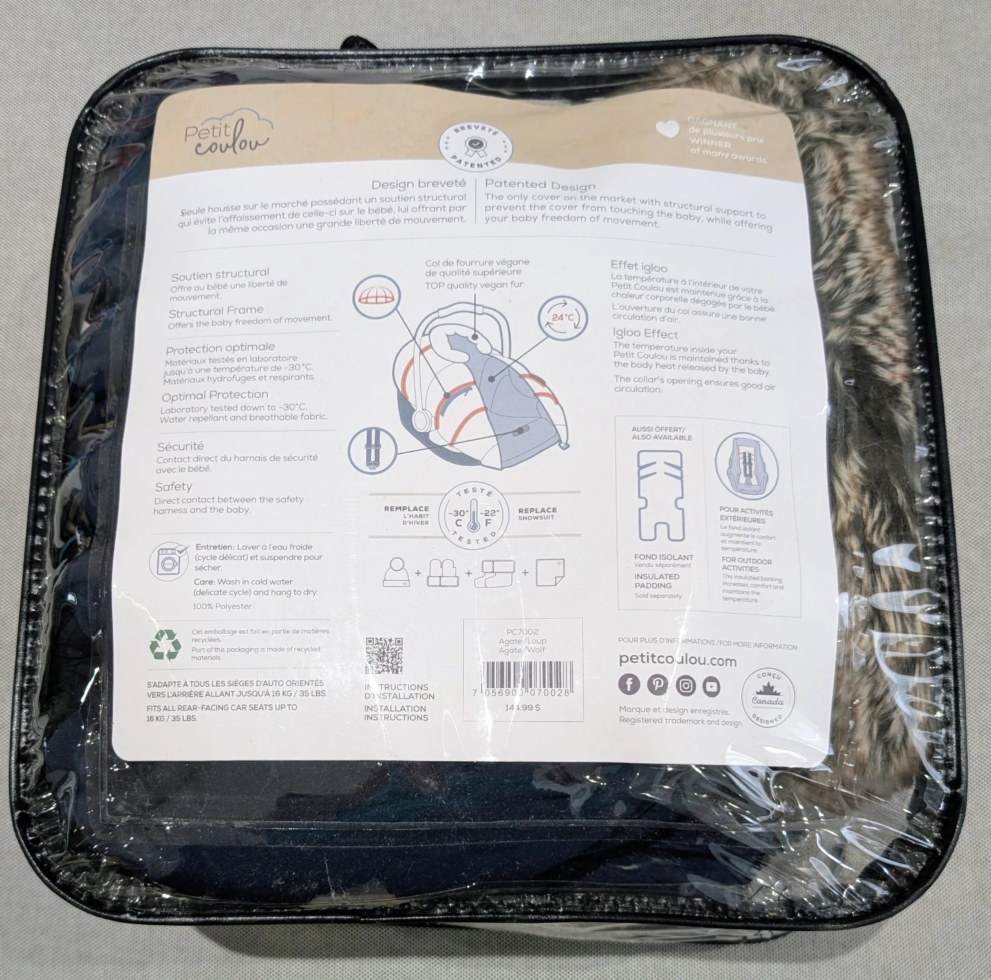 This Petit Coulou winter cover is designed for baby car seats. It's made with top-quality vegan fur and offers protection from -20°C to -30°C. It's also water-repellent and breathable. Keep your little one warm and comfy during colder months!