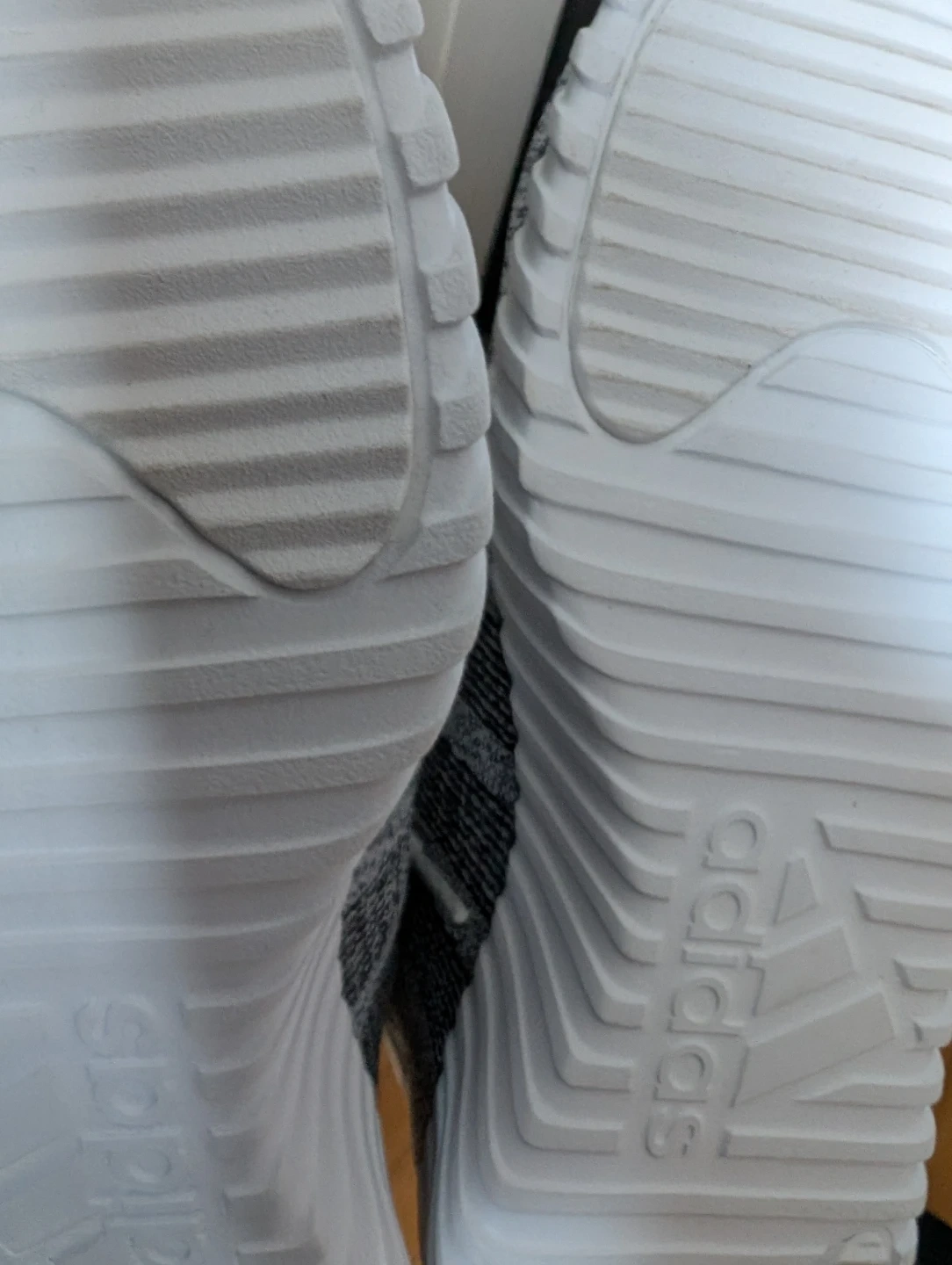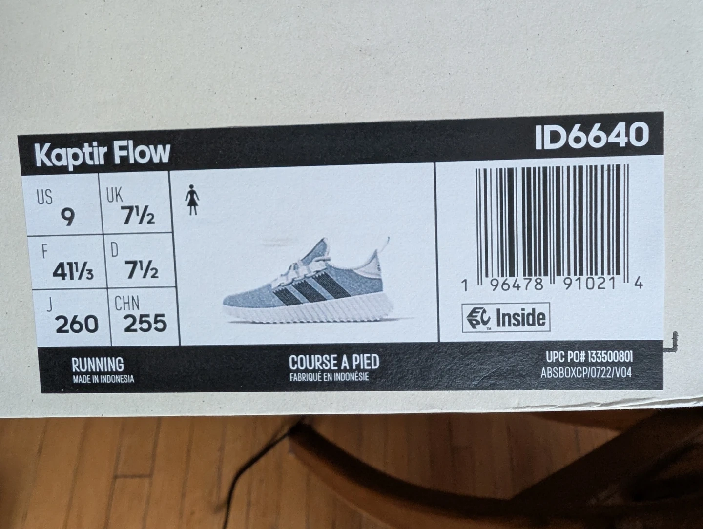 These are Adidas Kaptir Flow running shoes in a speckled grey with white accents. They're designed for running and come with their original box. Available in US size 9, UK 7.5, and EU 41 1/3.