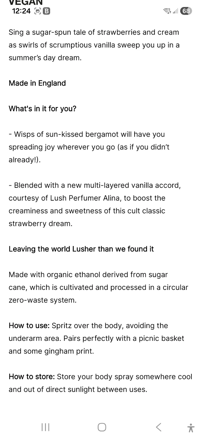 This LUSH body spray comes in a strawberry, vanilla, and cream scent. It's 200ml and made with organic ethanol from sugar cane. Spritz over your body for a sweet fragrance!