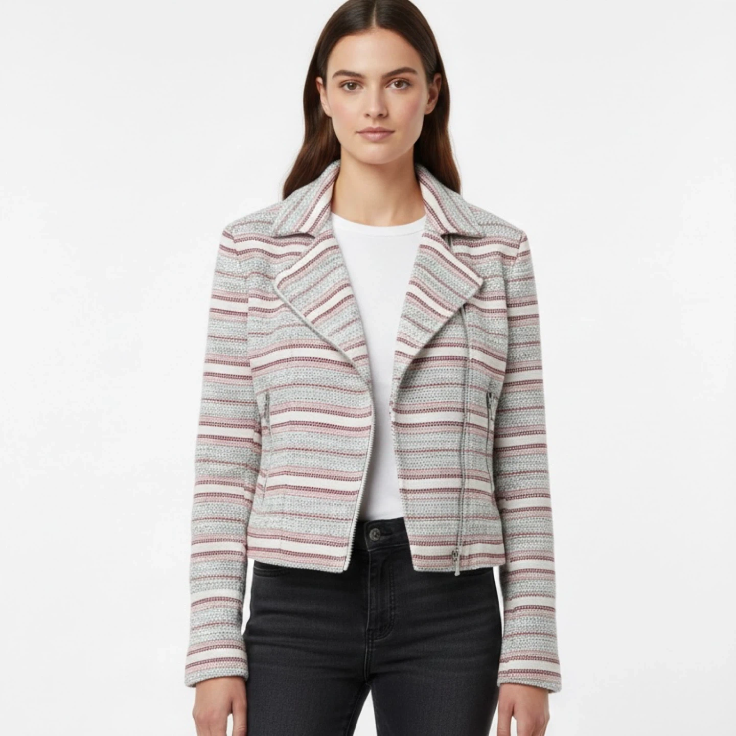 Bring a unique flair to your professional wardrobe with this RW&CO textured jacket. Featuring a white base with red and coral stripes and black flecks, this piece stands out with its modern off-centered zipper closure. The moto-inspired silhouette combined with the soft textured knit fabric creates a look that is both structured and comfortable. It features front zippered pockets and clean lines, perfect for layering over a simple top.