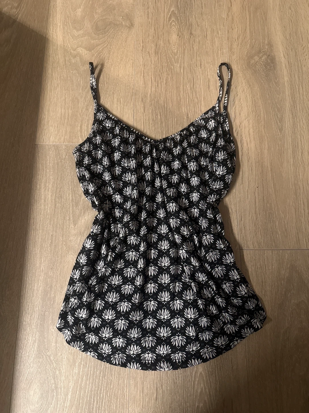 Selling a cute H&M cami top in size XS! It features a black and white floral pattern and is in great condition. Perfect for summer! Only worn twice in summer selling since im a student.