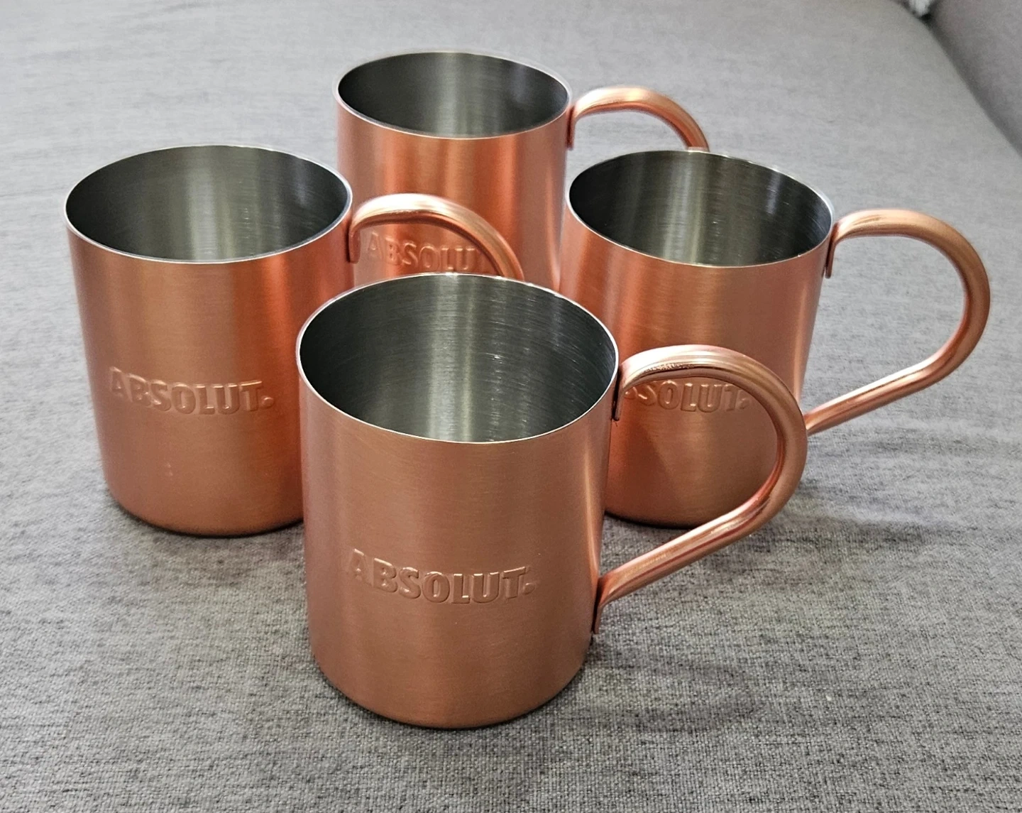 Selling a set of four copper Moscow Mule mugs from Absolut! They're in great shape and ready for your next cocktail night. Each mug has the Absolut logo embossed on the side. They stand about 4 inches tall. Perfect for enjoying a classic Moscow Mule or any other chilled beverage