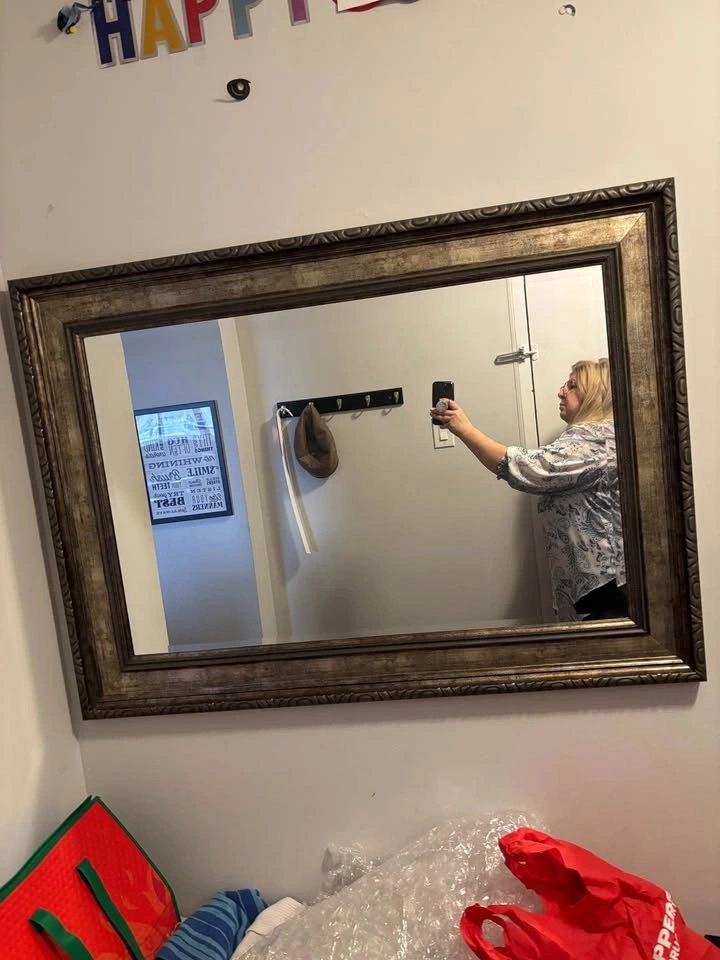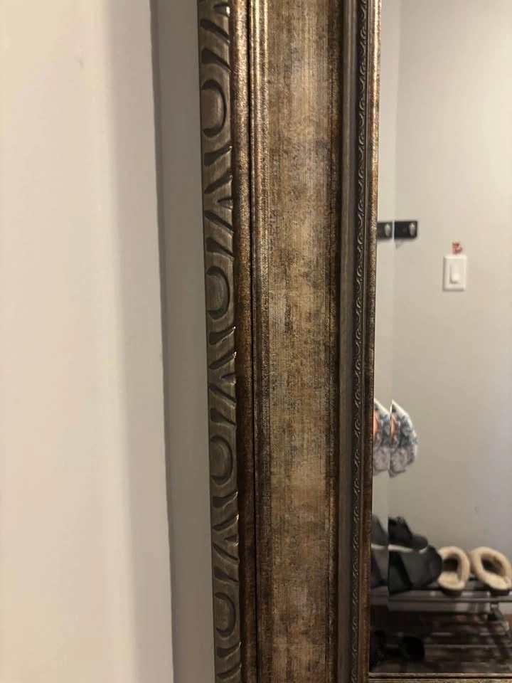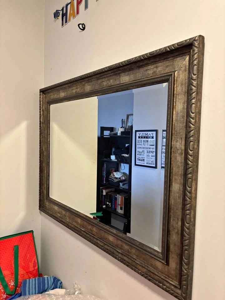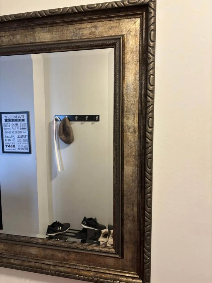 Beautiful mirror with a decorative frame. Has a rectangular shape and a metallic gold/bronze finish. Frame has ornate carvings. Good for entryway or living room wall. Dimensions 44”w x 32”h. Pick up 2300 South Millway, Mississauga