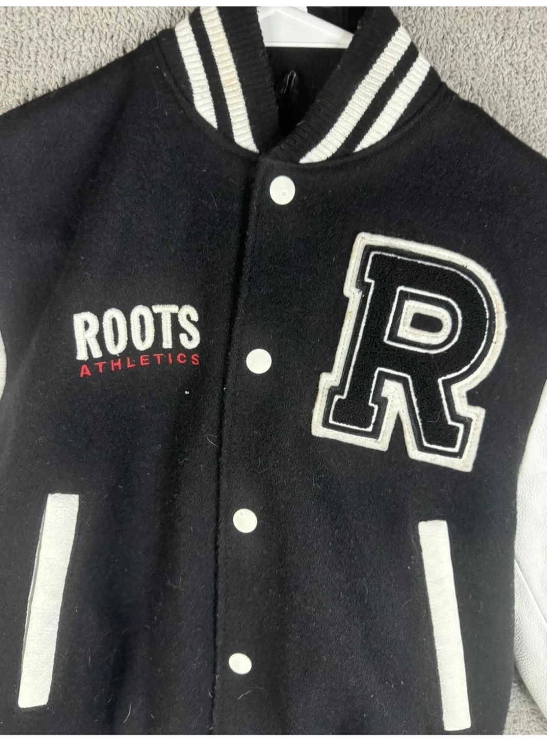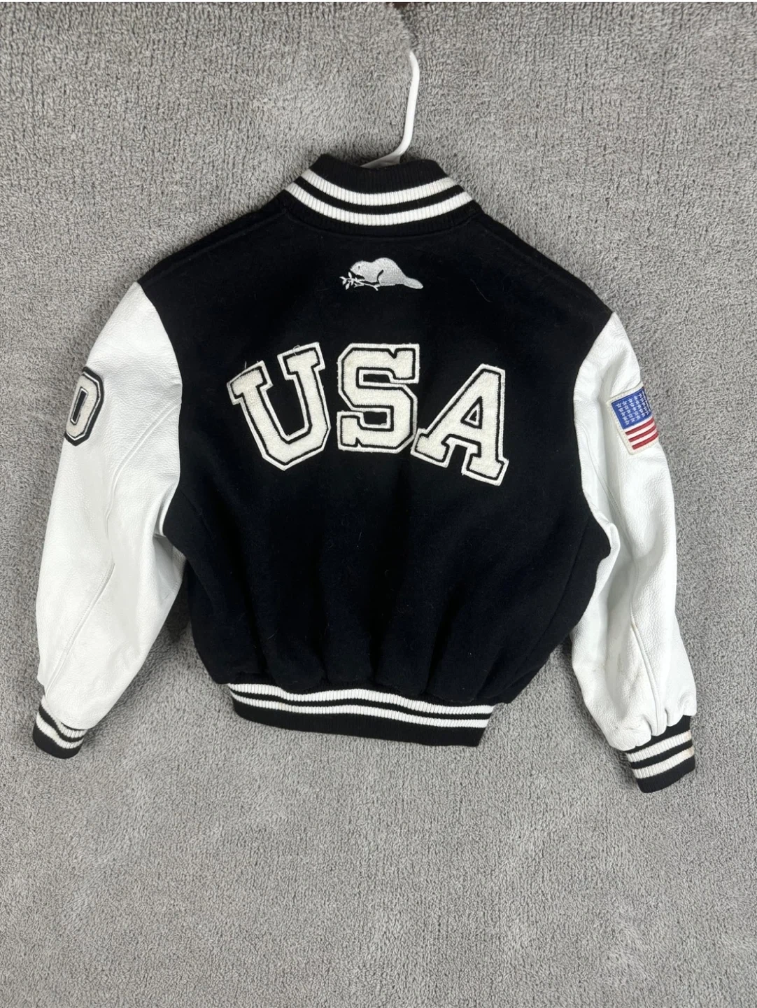 Black and white varsity jacket with "R" and "USA" embroidered on it. Features leather sleeves and ribbed cuffs and hem.size 4T/medium kids