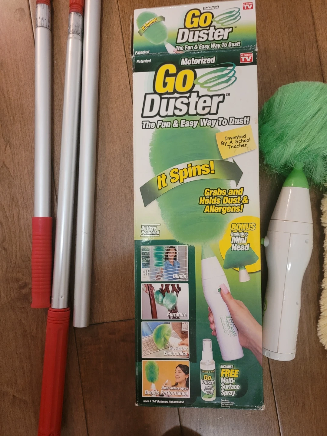 This motorized Go Duster spins to grab dust and allergens! It's battery powered and includes a mini head for smaller areas. Additional extension poles are also included.
