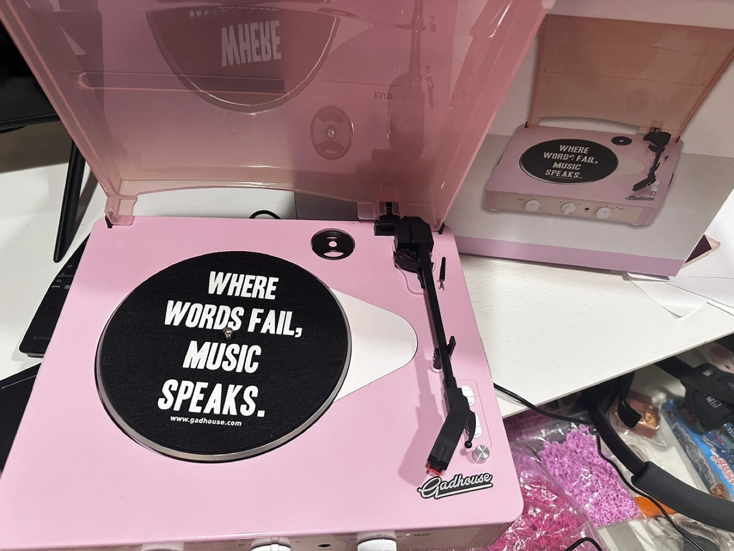 This Gadhous Retro MK II record player is a stylish pink colour. It plays vinyl records and has a transparent lid. The phrase 'Where words fail, music speaks' is displayed on the turntable. It's a fun way to enjoy your music collection!