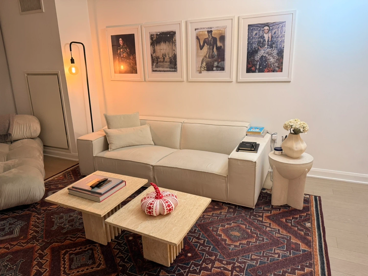 This is a modern cream-colored sofa. It comes with two matching throw pillows.