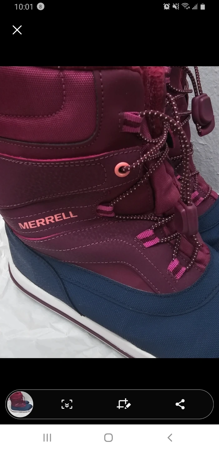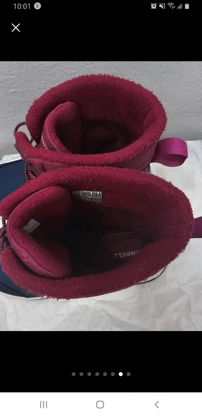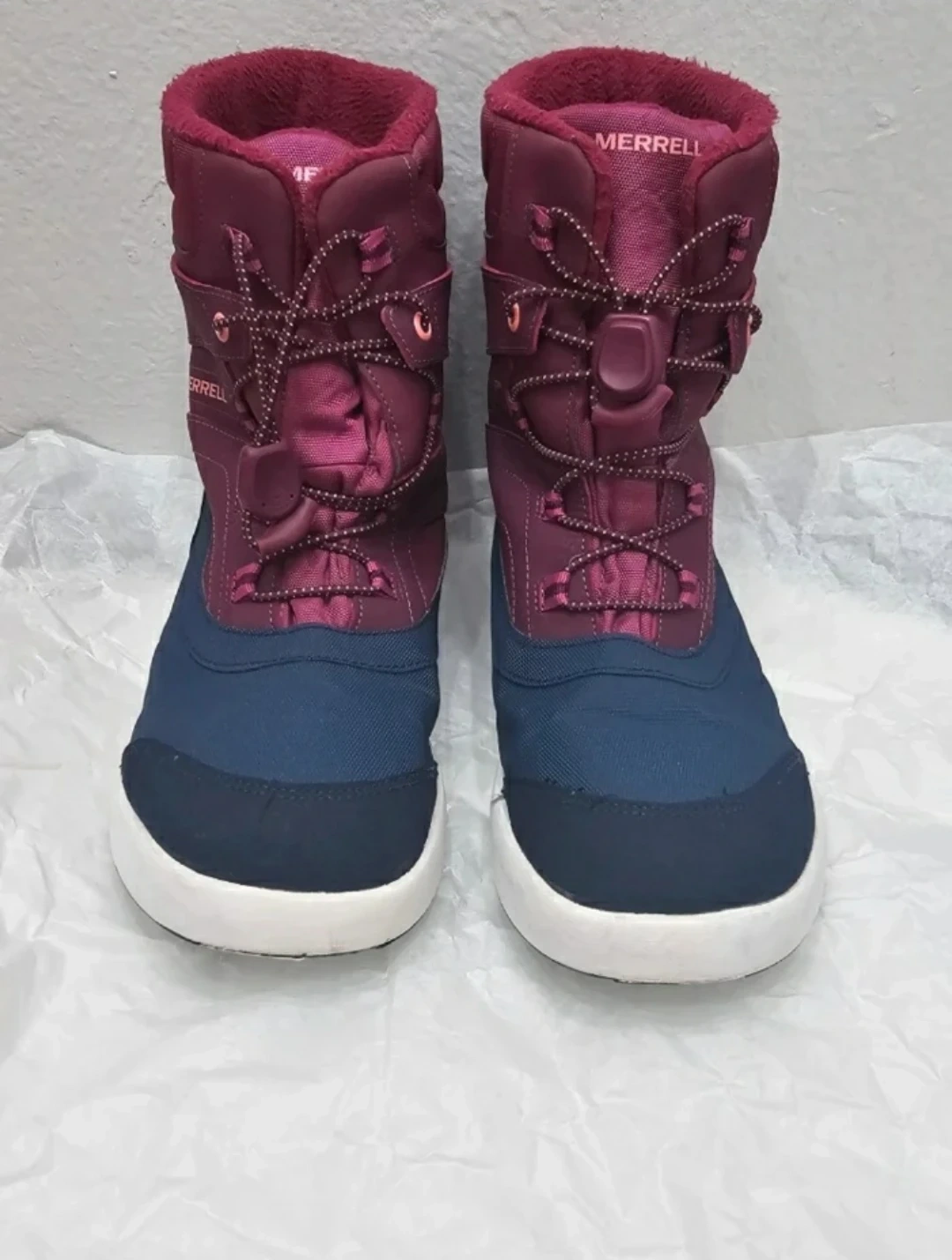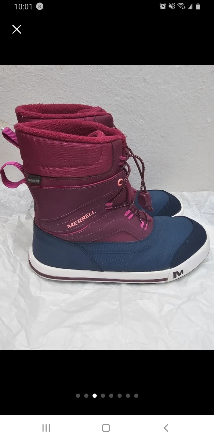 These Merrell winter boots are designed for warmth and dryness. They're burgundy and navy with a waterproof exterior. Features include cinch laces and pull tabs for easy on and off.