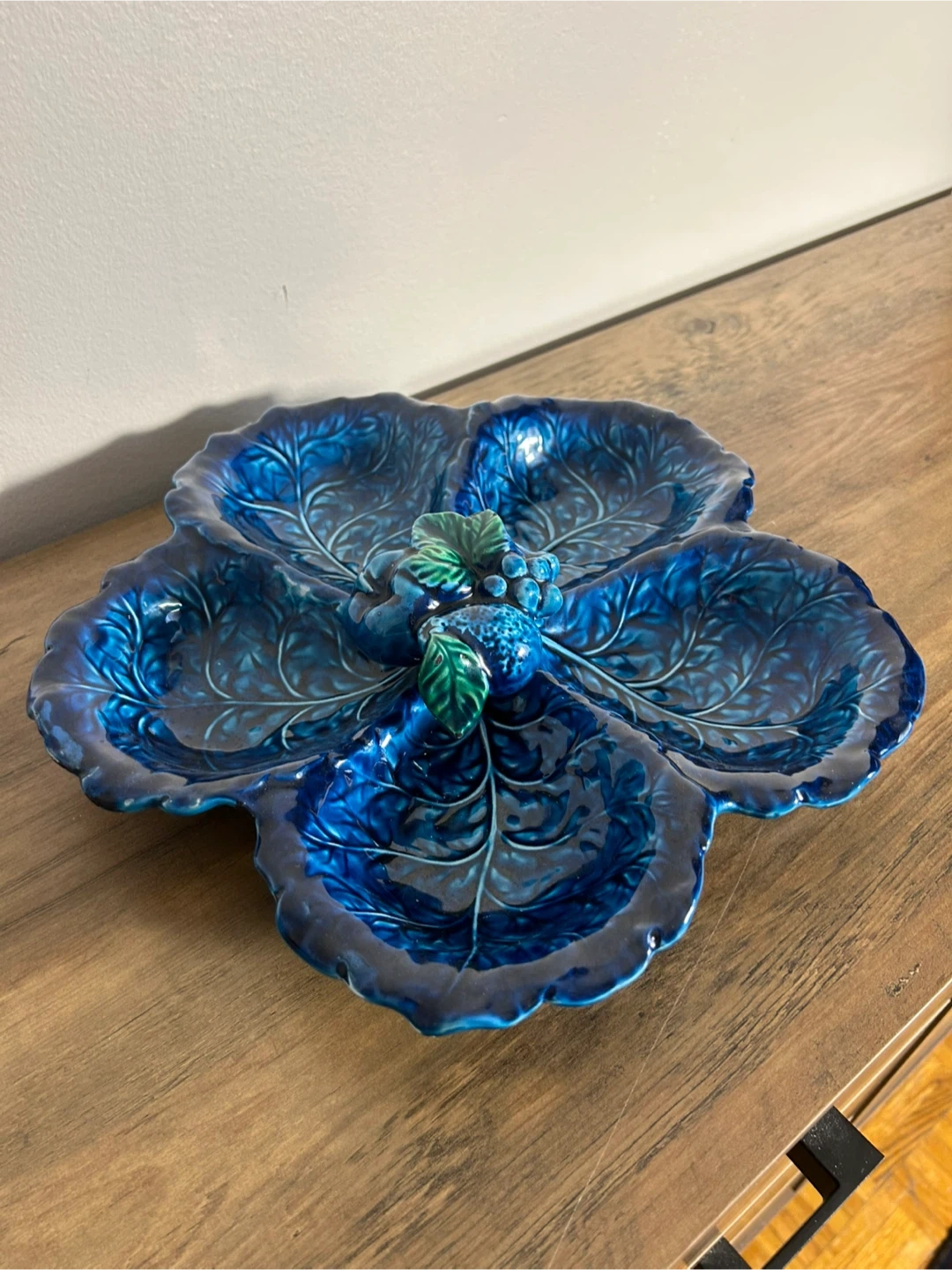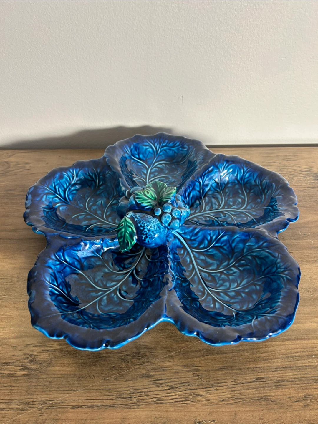 Elegant vintage divided ceramic serving dish from Japan, featuring a stunning cobalt blue leaf design.