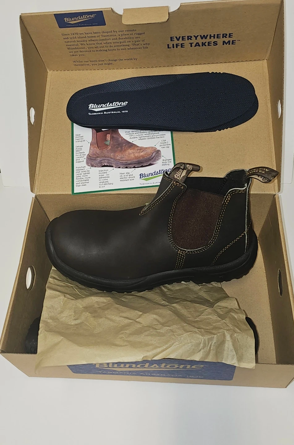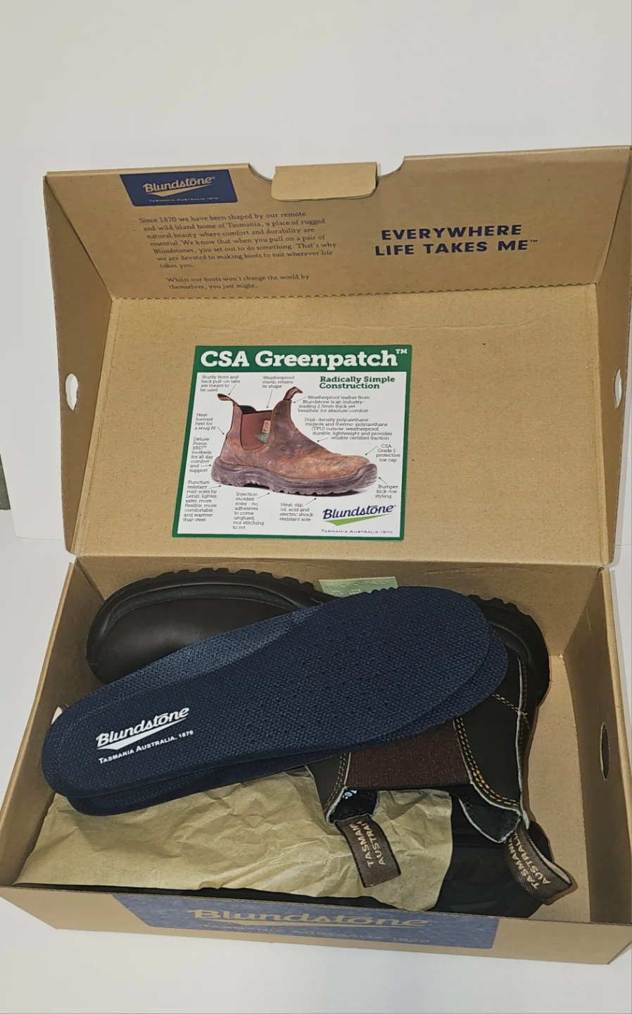 Blundstone CSA Greenpatch boots in stout brown premium leather. It's a size 8.5 AUS/UK, 9.5 USAM, 8.5 USAW. They feature PU/TPU elastic sided-V cut construction. Includes original box and an extra insole.